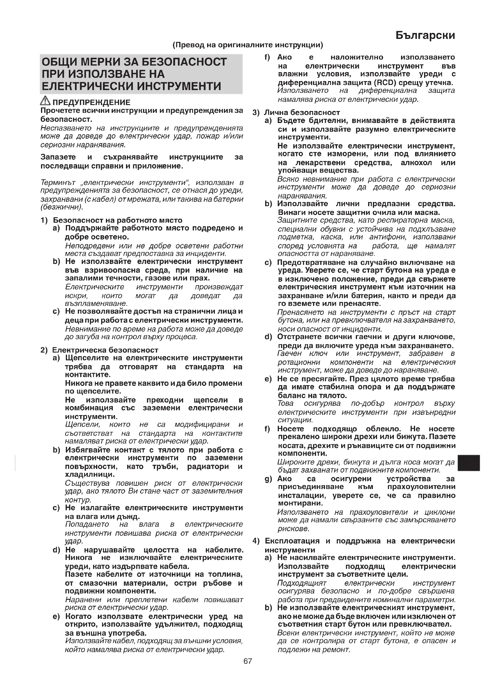 безопасно и по-добре свършена работа при предвидените номинални параметри. b) Не използвайте електрическият инструмент, ако не може да бъде включен или изключен от съответния старт бутон или превключвател. Всеки електрически инструмент, който не може да се контролира от старт бутона, е опасен и подлежи на ремонт. ОБЩИ МЕРКИ ЗА БЕЗОПАСНОСТ ПРИ ИЗПОЛЗВАНЕ НА ЕЛЕКТРИЧЕСКИ ИНСТРУМЕНТИ ПРЕДУПРЕЖДЕНИЕ Прочетете всички инструкции и предупреждения за безопасност. Неспазването на инструкциите и предупрежденията може да доведе до електрически удар, пожар и/или сериозни наранявания. Запазете и съхранявайте инструкциите за последващи справки и приложение. Терминът „електрически инструменти“, използван в предупрежденията за безопасност, се отнася до уреди, захранвани (с кабел) от мрежата, или такива на батерии (безжични).