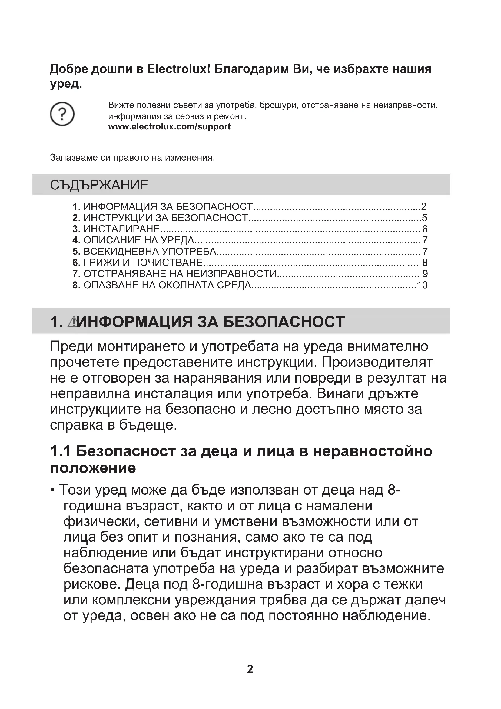 Вижте полезни съвети за употреба, брошури, отстраняване на неизправности,информация за сервиз и ремонт:www.electrolux.com/supportЗапазваме си правото на изменения. 1. ИНФОРМАЦИЯ ЗА БЕЗОПАСНОСТ............................................................22. ИНСТРУКЦИИ ЗА БЕЗОПАСНОСТ..............................................................5