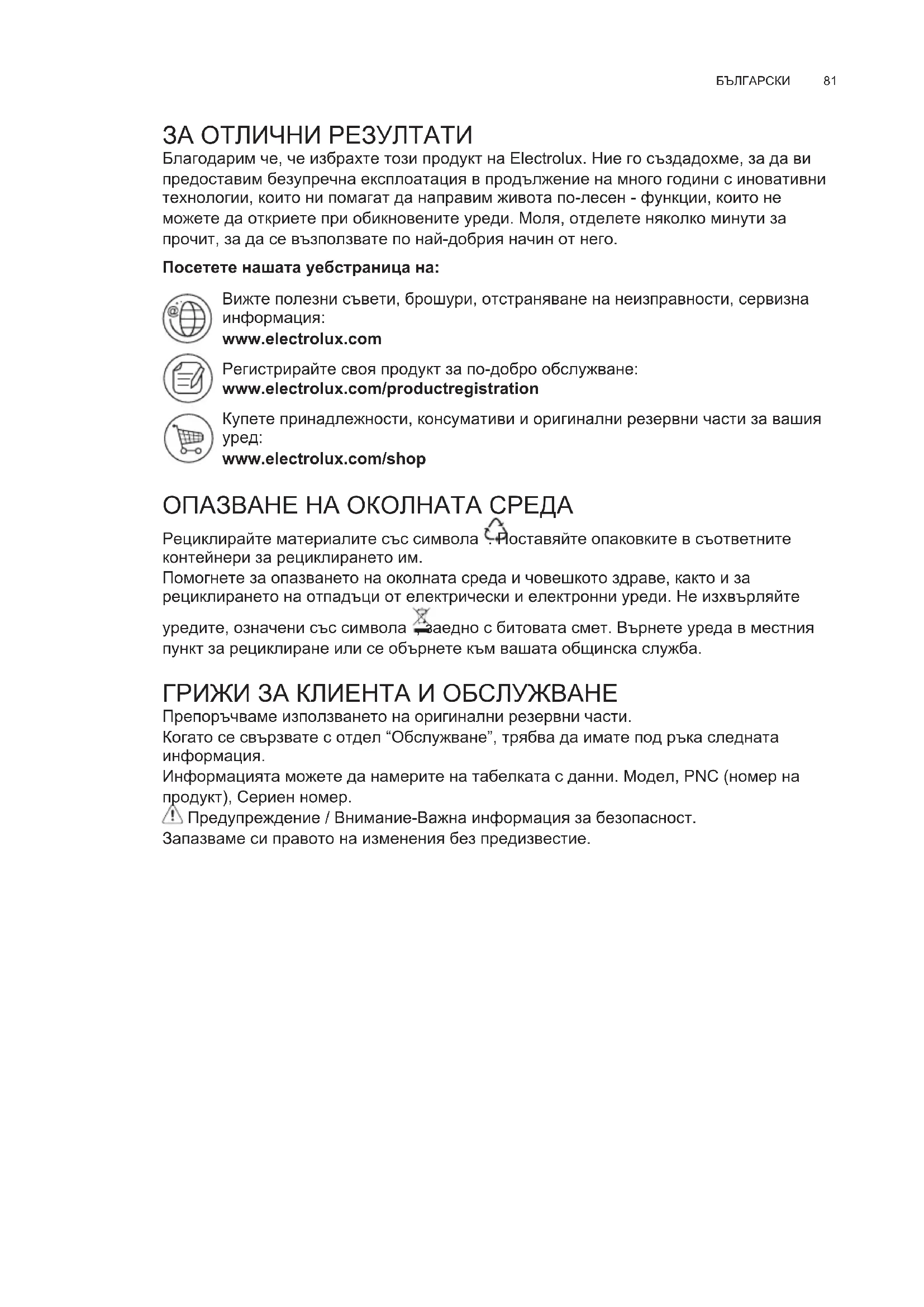 ЗА ОТЛИЧНИ РЕЗУЛТАТИ Благодарим че, че избрахте този продукт на Electrolux. Ние го създадохме, за да ви предоставим безупречна експлоатация в продължение на много години с иновативни технологии, които ни помагат да направим живота по-лесен - функции, които не можете да откриете при обикновените уреди. Моля, отделете няколко минути за прочит, за да се възползвате по най-добрия начин от него. Посетете нашата уебстраница на: Вижте полезни съвети, брошури, отстраняване на неизправности, сервизна информация: www.electrolux.com Регистрирайте своя продукт за по-добро обслужване: www.electrolux.com/productregistration Купете принадлежности, консумативи и оригинални резервни части за вашия