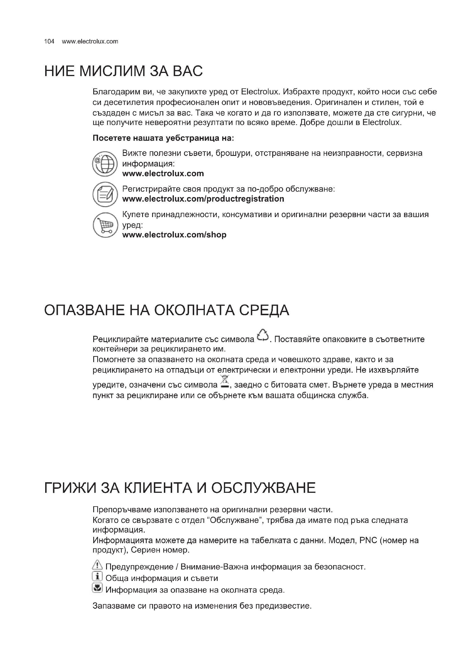 НИЕ МИСЛИМ ЗА ВАС Благодарим ви, че закупихте уред от Electrolux. Избрахте продукт, който носи със себе си десетилетия професионален опит и нововъведения. Оригинален и стилен, той е създаден с мисъл за вас. Така че когато и да го използвате, можете да сте сигурни, че ще получите невероятни резултати по всяко време. Добре дошли в Electrolux.