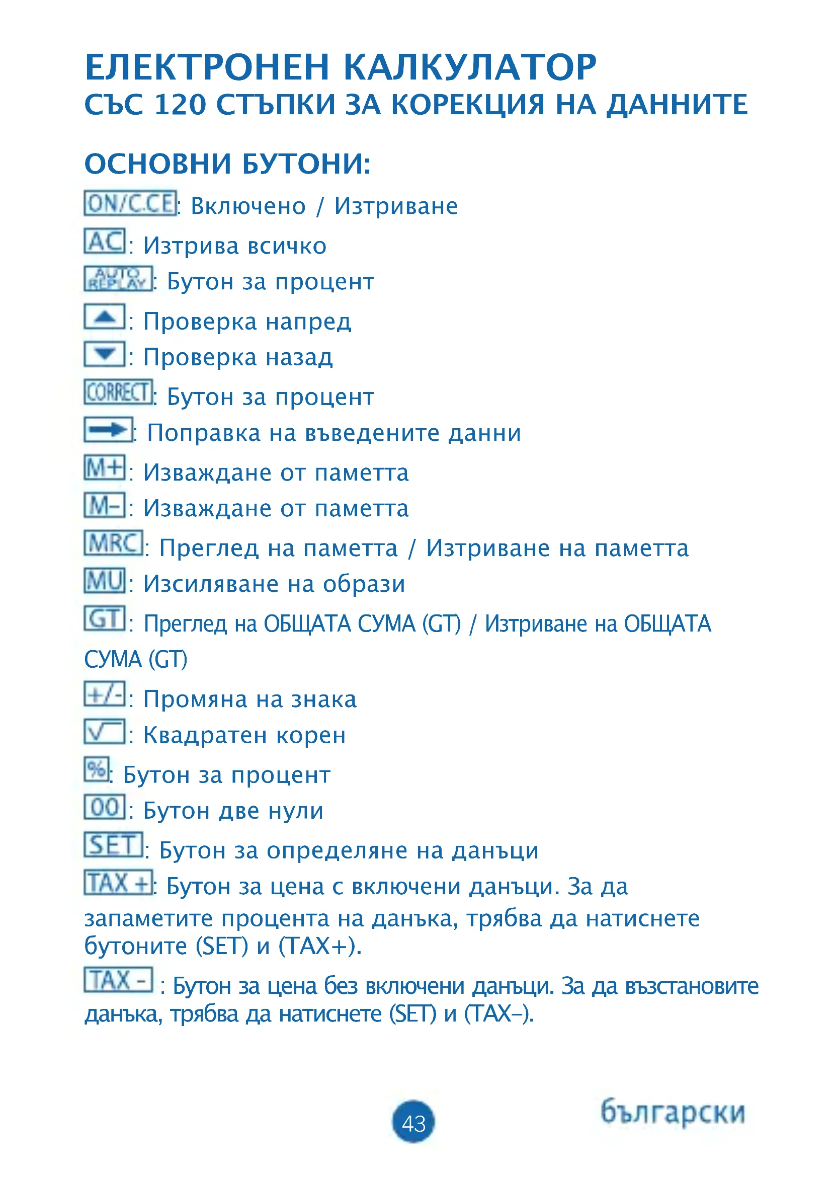Преглед на ОБЩАТА СУМА (GT) / Изтриване на ОБЩАТА СУМА (GT) : Промяна на знака : Квадратен корен : Бутон за процент : Бутон две нули : Бутон за определяне на данъци : Бутон за цена с включени данъци. За да запаметите процента на данъка, трябва да натиснете бутоните (SET) и (TAX+). : Бутон за цена без включени данъци. За да възстановите данъка, трябва да натиснете (SET) и (TAX-).44 ОПИСАНИЕ НА СЕЛЕКТОРИТЕ: