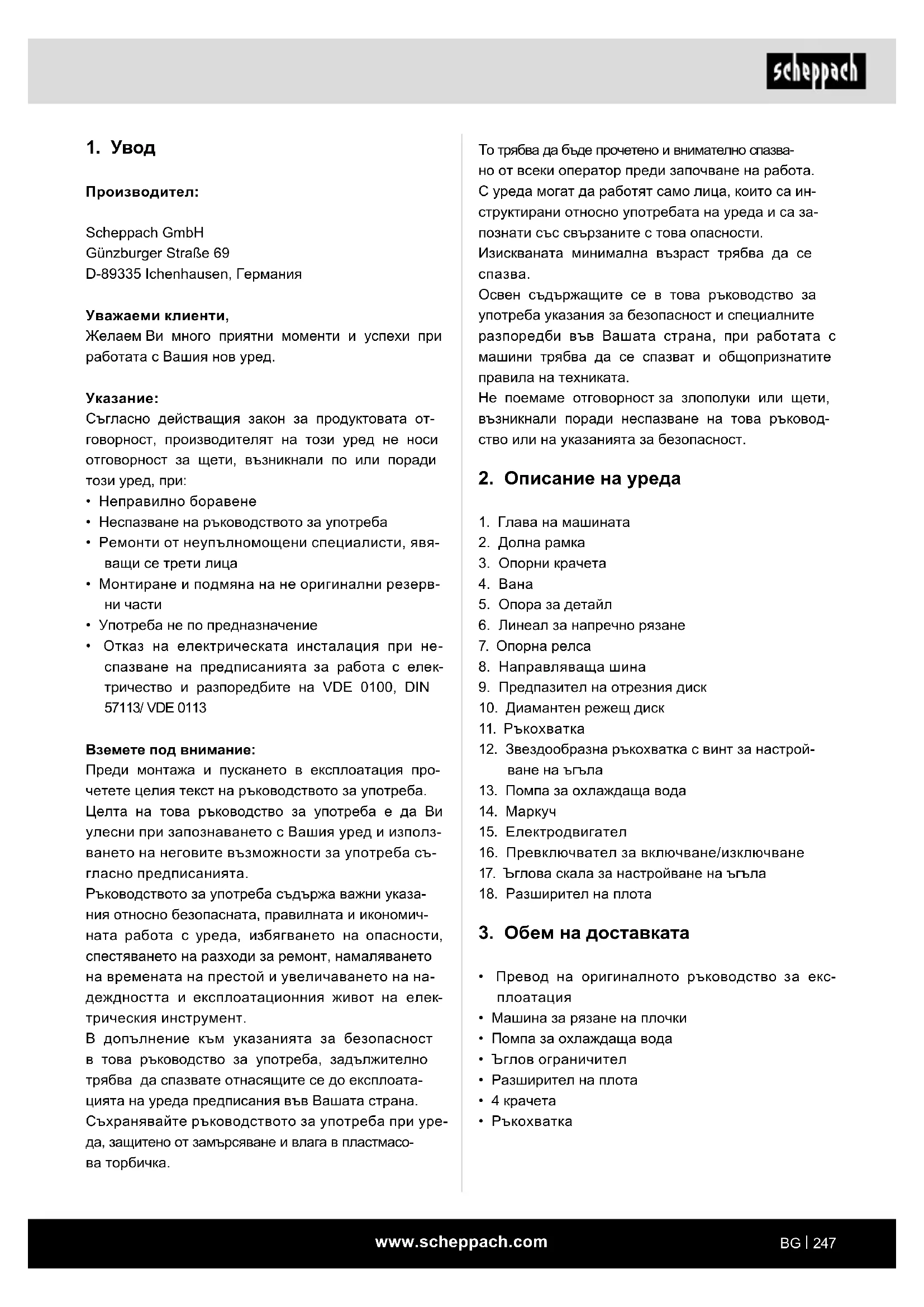 - Отказ на електрическата инсталация при не- спазване на предписанията за работа с елек- тричество и разпоредбите на VDE 0100, DIN 57113/ VDE 0113 Вземете под внимание: Преди монтажа и пускането в експлоатация про- четете целия текст на ръководството за употреба. Целта на това ръководство за употреба е да Ви улесни при запознаването с Вашия уред и използ- ването на неговите възможности за употреба съ- гласно предписанията. Ръководството за употреба съдържа важни указа- ния относно безопасната, правилната и икономич- ната работа с уреда, избягването на опасности, спестяването на разходи за ремонт, намаляването на времената на престой и увеличаването на на- деждността и експлоатационния живот на елек- трическия инструмент. В допълнение към указанията за безопасност в това ръководство за употреба, задължително трябва да спазвате отнасящите се до експлоата- цията на уреда предписания във Вашата страна. Съхранявайте ръководството за употреба при уре- да, защитено от замърсяване и влага в пластмасо- ва торбичка.www.scheppach.com
