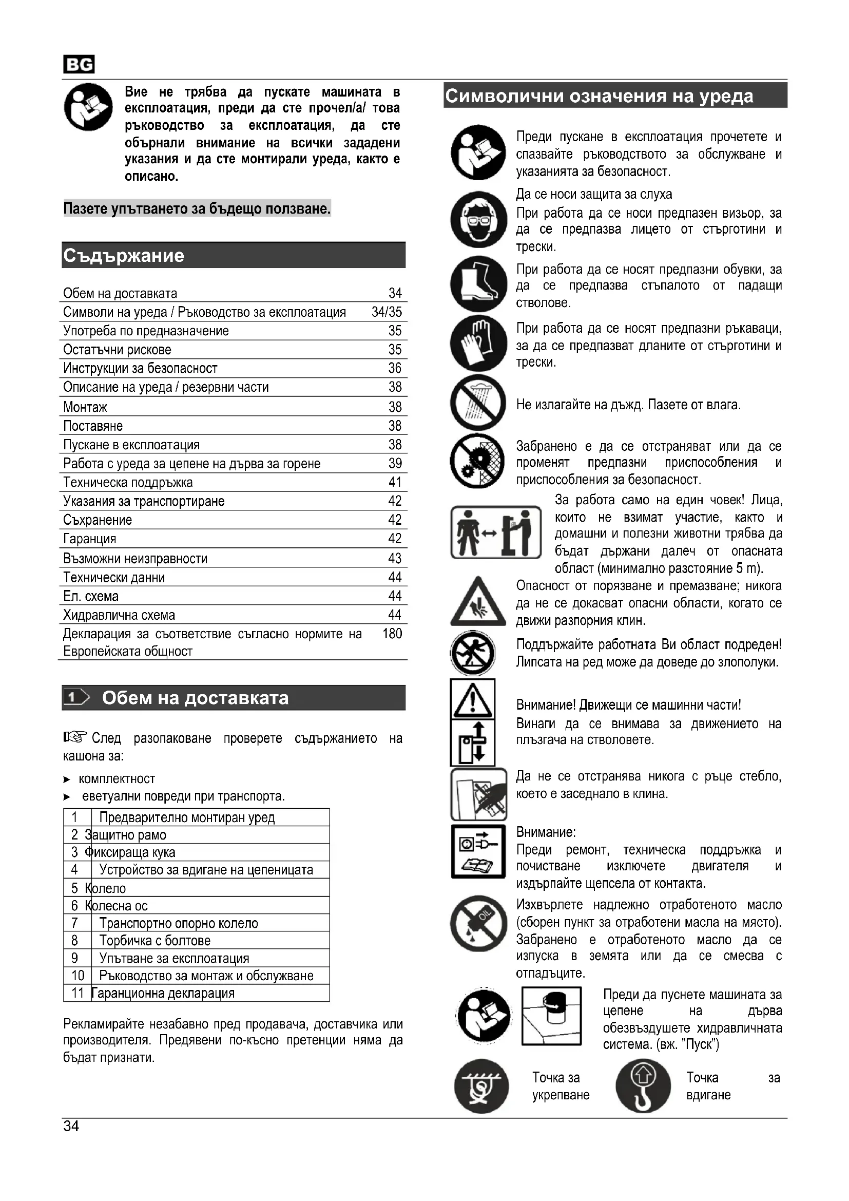 Обем на доставката 34 Символи на уреда / Ръководство за експлоатация 34/35 Употреба по предназначение 35 Остатъчни рискове 35 Инструкции за безопасност 36 Описание на уреда / резервни части 38 Монтаж 38 Поставяне 38 Пускане в експлоатация 38 Работа с уреда за цепене на дърва за горене 39 Техническа поддръжка 41 Указания за транспортиране 42 Съхранение 42 Гаранция 42 Възможни неизправности 43 Технически данни 44 Ел. схема 44 Хидравлична схема 44 Декларация за съответствие съгласно нормите на Европейската общност