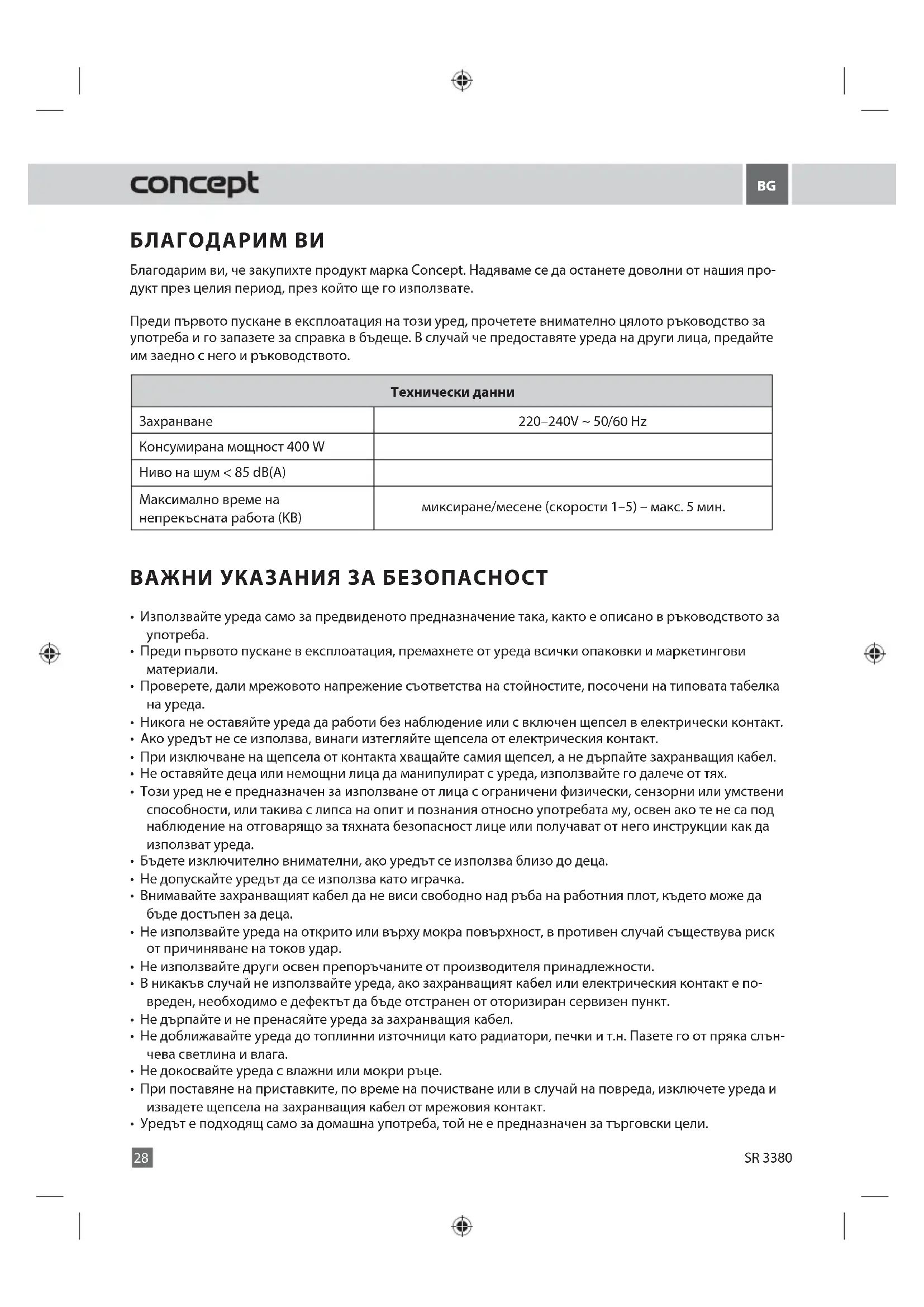 SR 3380 Sarežģījums Cēlonis RisinājumsБЛАГОДАРИМ ВИ Благодарим ви, че закупихте продукт марка Concept. Надяваме се да останете доволни от нашия про- дукт през целия период, през който ще го използвате. Преди първото пускане в експлоатация на този уред, прочетете внимателно цялото ръководство за употреба и го запазете за справка в бъдеще. В случай че предоставяте уреда на други лица, предайте им заедно с него и ръководството. Технически данни
