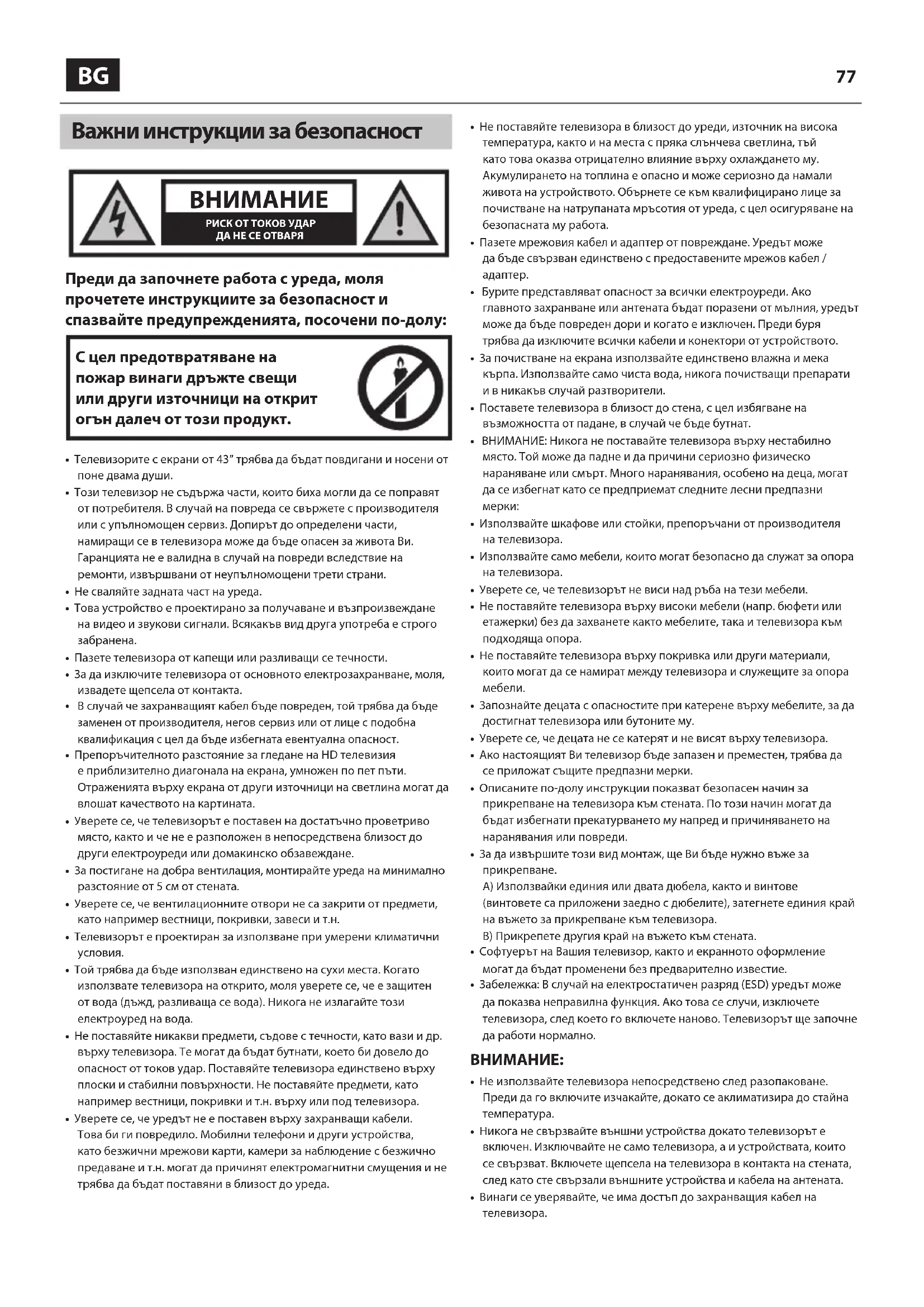 - Телевизорите с екрани от 43” трябва да бъдат повдигани и носени от поне двама души.• Този телевизор не съдържа части, които биха могли да се поправят от потребителя. В случай на повреда се свържете с производителя или с упълномощен сервиз. Допирът до определени части, намиращи се в телевизора може да бъде опасен за живота Ви. Гаранцията не е валидна в случай на повреди вследствие на ремонти, извършвани от неупълномощени трети страни.• Не сваляйте задната част на уреда.• Това устройство е проектирано за получаване и възпроизвеждане на видео и звукови сигнали. Всякакъв вид друга употреба е строго забранена.• Пазете телевизора от капещи или разливащи се течности.• За да изключите телевизора от основното електрозахранване, моля, извадете щепсела от контакта. В случай че захранващият кабел бъде повреден, той трябва да бъде заменен от производителя, негов сервиз или от лице с подобна квалификация с цел да бъде избегната евентуална опасност.• Препоръчителното разстояние за гледане на HD телевизия е приблизително диагонала на екрана, умножен по пет пъти. Отраженията върху екрана от други източници на светлина могат да влошат качеството на картината.• Уверете се, че телевизорът е поставен на достатъчно проветриво място, както и че не е разположен в непосредствена близост до други електроуреди или домакинско обзавеждане.• За постигане на добра вентилация, монтирайте уреда на минимално разстояние от 5 см от стената.• Уверете се, че вентилационните отвори не са закрити от предмети, като например вестници, покривки, завеси и т.н.• Телевизорът е проектиран за използване при умерени климатични условия.• Той трябва да бъде използван единствено на сухи места. Когато използвате телевизора на открито, моля уверете се, че е защитен от вода (дъжд, разливаща се вода). Никога не излагайте този електроуред на вода.• Не поставяйте никакви предмети, съдове с течности, като вази и др. върху телевизора. Те могат да бъдат бутнати, което би довело до опасност от токов удар. Поставяйте телевизора единствено върху плоски и стабилни повърхности. Не поставяйте предмети, като например вестници, покривки и т.н. върху или под телевизора.• Уверете се, че уредът не е поставен върху захранващи кабели. Това би ги повредило. Мобилни телефони и други устройства, като безжични мрежови карти, камери за наблюдение с безжично предаване и т.н. могат да причинят електромагнитни смущения и не трябва да бъдат поставяни в близост до уреда.• Не поставяйте телевизора в близост до уреди, източник на висока температура, както и на места с пряка слънчева светлина, тъй като това оказва отрицателно влияние върху охлаждането му. Акумулирането на топлина е опасно и може сериозно да намали живота на устройството. Обърнете се към квалифицирано лице за почистване на натрупаната мръсотия от уреда, с цел осигуряване на безопасната му работа.• Пазете мрежовия кабел и адаптер от повреждане. Уредът може да бъде свързван единствено с предоставените мрежов кабел / адаптер.