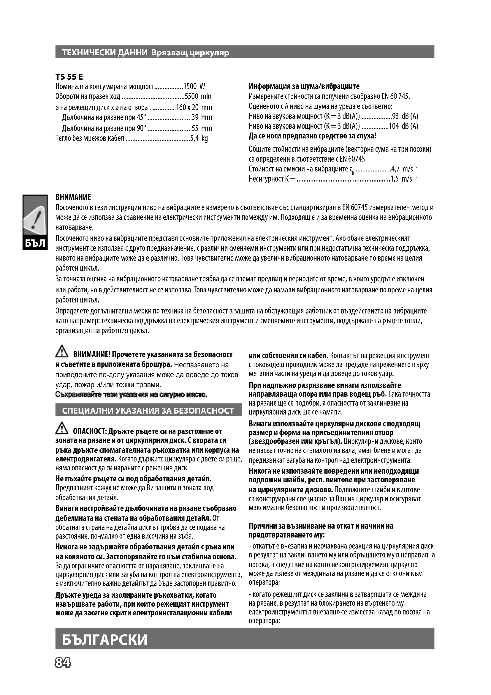 ОПАСНОСТ: Дръжте ръцете си на разстояние от зоната на рязане и от циркулярния диск. С втората си ръка дръжте спомагателната ръкохватка или корпуса на електродвигателя. Когато държите циркуляра с двете си ръце, няма опасност да ги нараните с режещия диск. Не пъхайте ръцете си под обработвания детайл. Предпазният кожух не може да Ви защити в зоната под обработвания детайл. Винаги настройвайте дълбочината на рязане съобразно дебелината на стената на обработвания детайл. От обратната страна на детайла дискът трябва да се подава на разстояние, по-малко от една височина на зъба. Никога не задържайте обработвания детайл с ръка или на коляното си. Застопорявайте го към стабилна основа. За да ограничите опасността от нараняване, заклинване на циркулярния диск или загуба на контрол на електроинструмента, е изключително важно детайлът да бъде застопорен правилно. Дръжте уреда за изолираните ръкохватки, когато извършвате работи, при които режещият инструмент може да засегне скрити електроинсталационни кабели или собствения си кабел. Контактът на режещия инструмент с тоководещ проводник може да предаде напрежението върху метални части на уреда и да доведе до токов удар. При надлъжно разрязване винаги използвайте направляваща опора или прав водещ ръб. Така точността на рязане ще се подобри, а опасността от заклинване на циркулярния диск ще се намали. Винаги използвайте циркулярни дискове с подходящ размер и форма на присъединителния отвор (звездообразен или кръгъл). Циркулярни дискове, които не пасват точно на стъпалото на вала, имат биене и могат да предизвикат загуба на контрол над електроинструмента. Никога не използвайте повредени или неподходящи подложни шайби, респ. винтове при застопоряване на циркулярните дискове. Подложните шайби и винтове са конструирани специално за Вашия циркуляр и осигуряват максимални безопасност и производителност. Причини за възникване на откат и начини на предотвратяването му: - откатът е внезапна и неочаквана реакция на циркулярния диск в резултат на заклинването му или обръщането му в неправилна посока, в следствие на която неконтролируемият циркуляр може да излезе от междината на рязане и да се отклони към