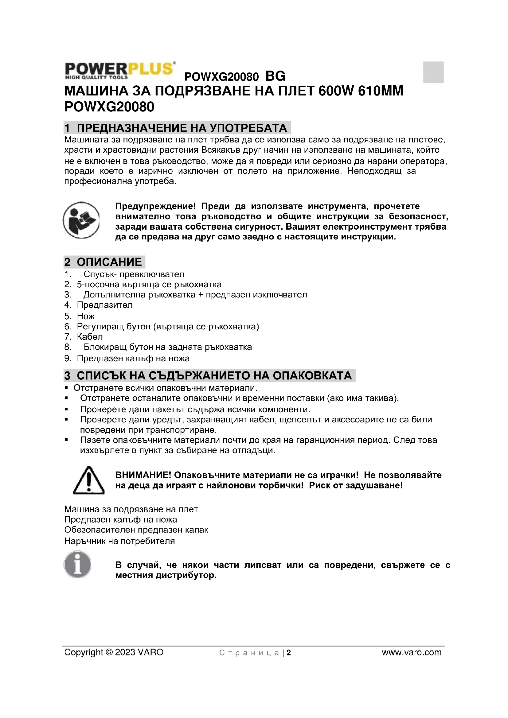 - 13 ДЕКЛАРАЦИЯ ЗА СЪОТВЕТСТВИЕ POWXG20080 BG Copyright © 2023 VARO С т р а н и ц а | 2 www.varo.com МАШИНА ЗА ПОДРЯЗВАНЕ НА ПЛЕТ 600W 610MM POWXG20080 1 ПРЕДНАЗНАЧЕНИЕ НА УПОТРЕБАТА Машината за подрязване на плет трябва да се използва само за подрязване на плетове, храсти и храстовидни растения Всякакъв друг начин на използване на машината, който не е включен в това ръководство, може да я повреди или сериозно да нарани оператора, поради което е изрично изключен от полето на приложение. Неподходящ за професионална употреба. Предупреждение! Преди да използвате инструмента, прочетете внимателно това ръководство и общите инструкции за безопасност, заради вашата собствена сигурност. Вашият електроинструмент трябва да се предава на друг само заедно с настоящите инструкции. 2 ОПИСАНИЕ p. 8