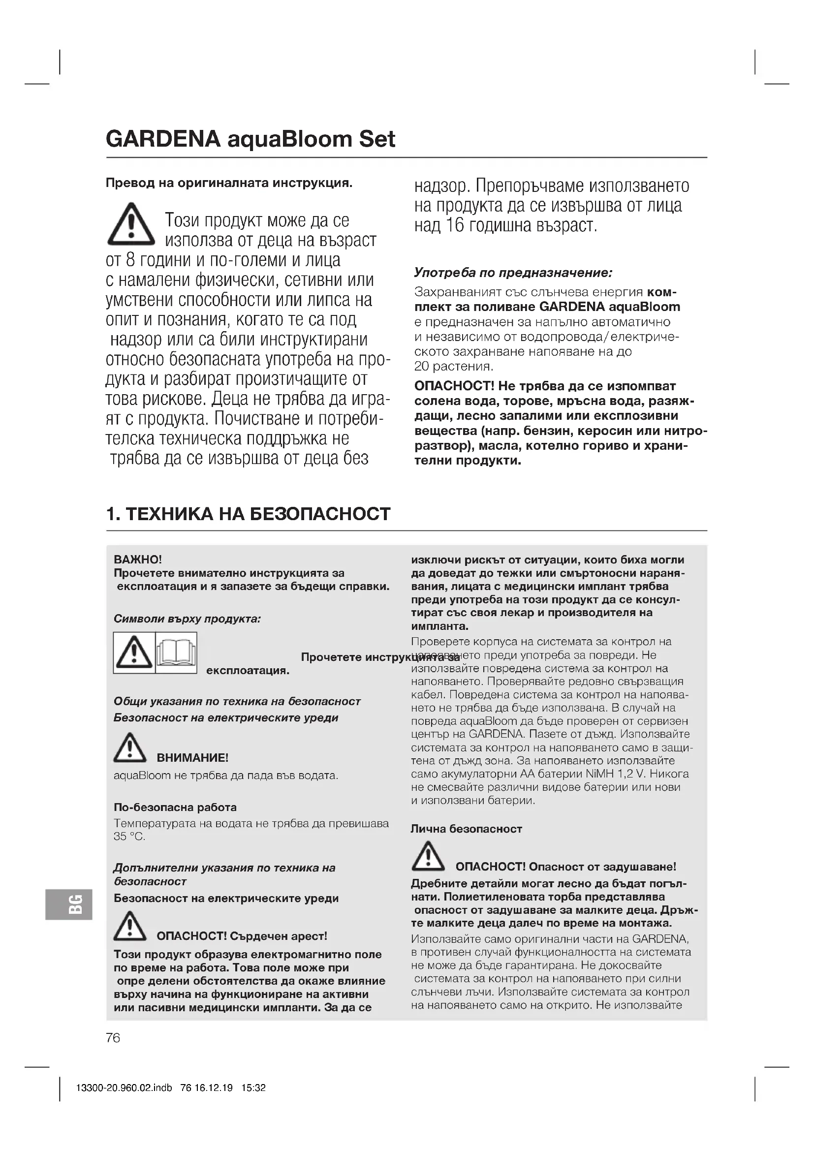 13300-20.960.02.indb 75 16.12.19 15:32Превод на оригиналната инструкция. Този продукт може да се използва от деца на възраст от 8 години и по-големи и лица с намалени физически, сетивни или умствени способности или липса на опит и познания, когато те са под надзор или са били инструктирани относно безопасната употреба на про- дукта и разбират произтичащите от това рискове. Деца не трябва да игра- ят с продукта. Почистване и потреби- телска техническа поддръжка не трябва да се извършва от деца без надзор. Препоръчваме използването на продукта да се извършва от лица над 16 годишна възраст. Употреба по предназначение: Захранваният със слънчева енергия ком- плект за поливане GARDENA aquaBloom епредназначен за напълно автоматично инезависимо от водопровода / електриче- скотозахранване напояване на до 20 растения. ОПАСНОСТ! Не трябва да се изпомпват солена вода, торове, мръсна вода, разяж- дащи, лесно запалими или експлозивни вещества (напр. бензин, керосин или нитро- разтвор), масла, котелно гориво и храни- телни продукти.