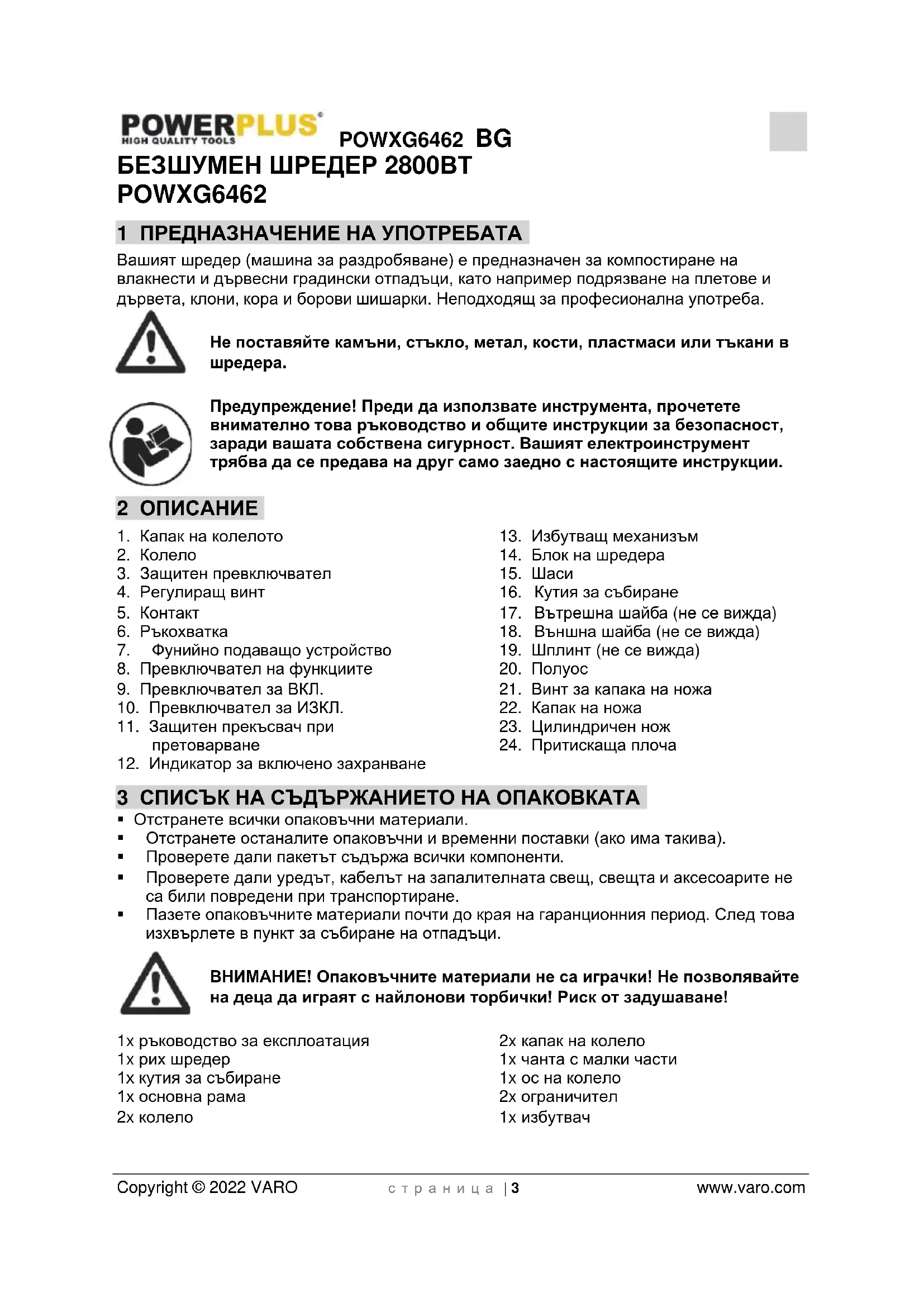 - Не допускайте присъствие на деца или странични лица, когато работите с електроинструмент. Разсейването може да ви накара да загубите контрол върху него.POWXG6462 BG Copyright © 2022 VARO с т р а н и ц а | 5 www.varo.com