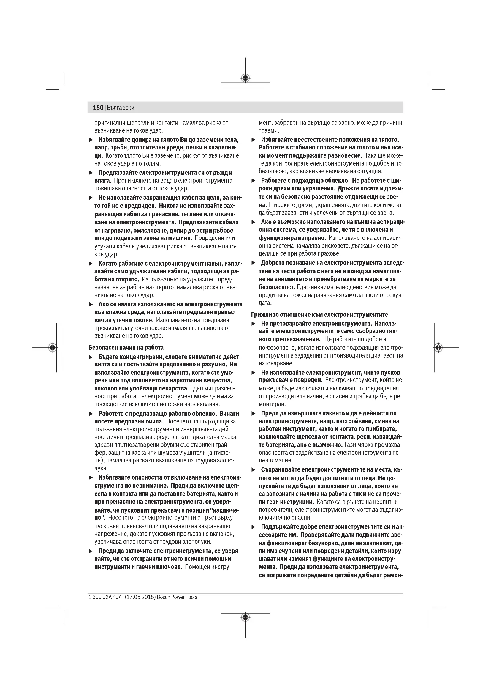 Безопасност на работното място u Пазете работното си място чисто и добре осветено. Разхвърляните или тъмни работни места са предпос- тавка за инциденти. u Не работете с електроинструмента в среда с пови- шена опасност от възникване на експлозия, в бли- зост до леснозапалими течности, газове или прахо- образни материали. По време на работа в електроин- струментите се отделят искри, които могат да възпла- менят прахообразни материали или пари. u Дръжте деца и странични лица на безопасно разсто- яние, докато работите с електроинструмента. Ако вниманието Ви бъде отклонено, може да загубите кон- трола над електроинструмента. Безопасност при работа с електрически ток u Щепселът на електроинструмента трябва да е под- ходящ за ползвания контакт. В никакъв случай не се допуска изменяне на конструкцията на щепсе- ла. Когато работите със занулени електроуреди, не използвайте адаптери за щепсела. Ползването на Български | 149 Bosch Power Tools 1 609 92A 49A | (17.05.2018)150 | Български 1 609 92A 49A | (17.05.2018) Bosch Power Tools оригинални щепсели и контакти намалява риска от възникване на токов удар. u Избягвайте допира на тялото Ви до заземени тела, напр. тръби, отоплителни уреди, печки и хладилни- ци. Когато тялото Ви е заземено, рискът от възникване на токов удар е по‑голям. u Предпазвайте електроинструмента си от дъжд и влага. Проникването на вода в електроинструмента повишава опасността от токов удар. u Не използвайте захранващия кабел за цели, за кои- то той не е предвиден. Никога не използвайте зах- ранващия кабел за пренасяне, теглене или откача- ване на електроинструмента. Предпазвайте кабела от нагряване, омасляване, допир до остри ръбове или до подвижни звена на машини. Повредени или усукани кабели увеличават риска от възникване на то-