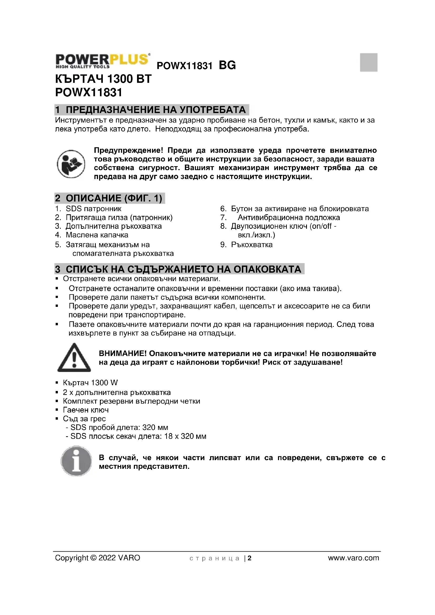 - Трябва да върнете недемонтирания инструмент на продавача в приемливо чисто състояние, в оригиналното му лято куфарче, ако устройството има такова, придружавано от доказателството за покупката. 15 ОКОЛНА СРЕДА За случаите когато машината се нуждае от смяна на части след продължителна употреба, същите да не се изхвърлят в кофите за битови отпадъци, а да се изхвърлят по екологично съобразен начин. Електротехническите продукти за брак да не се изхвърлят заедно в кофите за домакински отпадъци. Същите да се рециклират, ако има съоръжения за това. За повече подробности по препоръките за рециклиране да се направи запитване до местните власти или до.POWX11831 BG Copyright © 2022 VARO с т р а н и ц а | 10 www.varo.com 16 ДЕКЛАРАЦИЯ ЗА СЪОТВЕТСТВИЕ VARO N.V. - Vic. Van Rompuy N.V. – Joseph Van Instraat 9 – BE2500 Lier – Белгия декларират, че Продукт: Къртач Марка: POWERplus Mодел: POWX11831 е в съответствие с основните изисквания и други съответни разпоредби на приложимите Европейски директиви, базирани върху прилагането на Европейските хармонизирани стандарти. Всяка неупълномощена модификация на апарата анулира тази декларация. Европейски директиви (включително техните промени към датата на подписване, ако са приложими): 2011/65/EU 2006/42/EC 2014/30/EU 2000/14/EC Annex VI LwA Measured 100dB(A) Guaranteed 105dB(A) Notified Body ISET – IT Европейски хармонизирани стандарти (включително техните промени към датата на подписване, ако са приложими): EN60745-1 : 2009 EN60745-2-6 : 2010 EN55014-1 : 2017 EN55014-2 : 2015