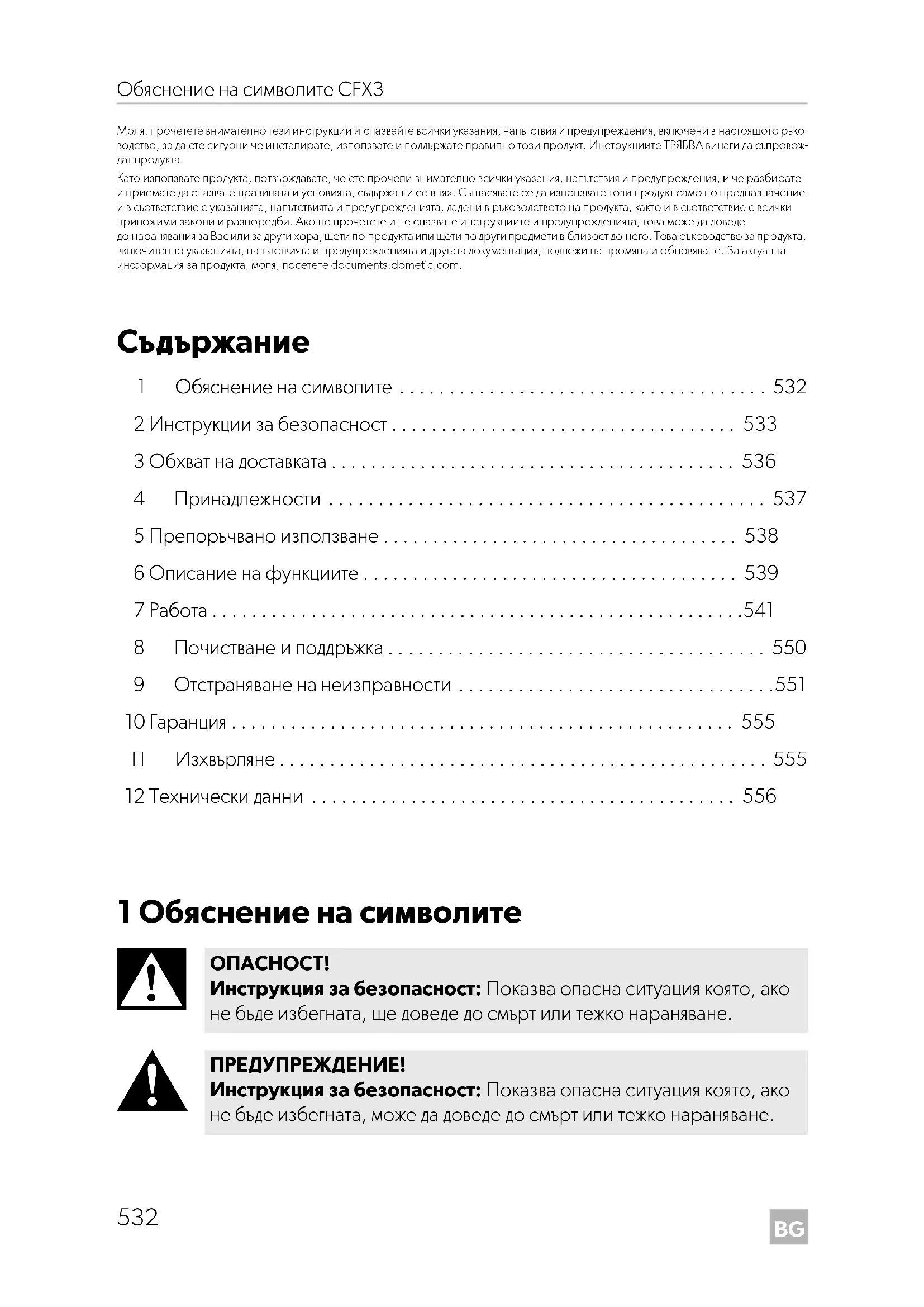 Моля, прочетете внимателно тези инструкции и спазвайте всички указания, напътствия и предупреждения, включени в настоящото ръко- водство, за да сте сигурни че инсталирате, използвате и поддържате правилно този продукт. Инструкциите ТРЯБВА винаги да съпровож- дат продукта. Като използвате продукта, потвърждавате, че сте прочели внимателно всички указания, напътствия и предупреждения, и че разбирате и приемате да спазвате правилата и условията, съдържащи се в тях. Съгласявате се да използвате този продукт само по предназначение и в съответствие с указанията, напътствията и предупрежденията, дадени в ръководството на продукта, както и в съответствие с всички приложими закони и разпоредби. Ако не прочетете и не спазвате инструкциите и предупрежденията, това може да доведе до наранявания за Вас или за други хора, щети по продукта или щети по други предмети в близост до него. Това ръководство за продукта, включително указанията, напътствията и предупрежденията и другата документация, подлежи на промяна и обновяване. За актуална информация за продукта, моля, посетете documents.dometic.com.