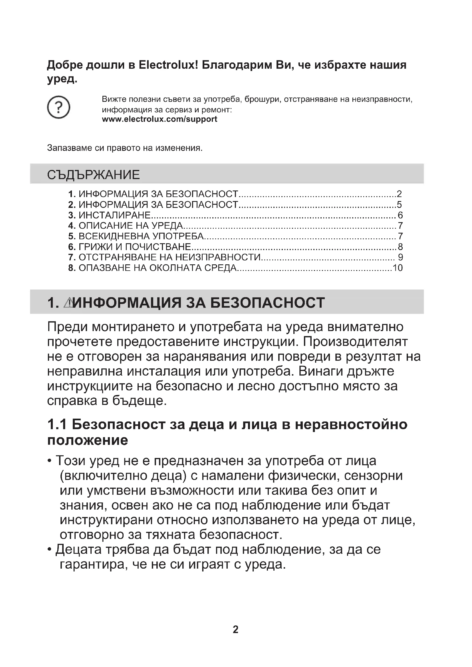 Вижте полезни съвети за употреба, брошури, отстраняване на неизправности,информация за сервиз и ремонт:www.electrolux.com/supportЗапазваме си правото на изменения. 1. ИНФОРМАЦИЯ ЗА БЕЗОПАСНОСТ............................................................22. ИНФОРМАЦИЯ ЗА БЕЗОПАСНОСТ............................................................5