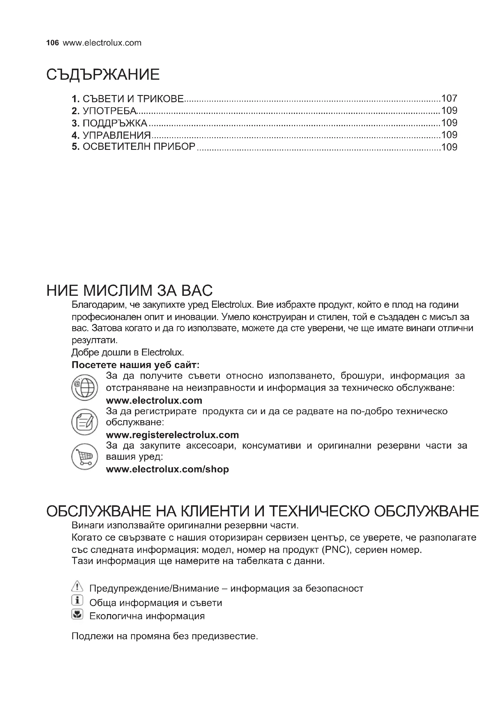 Добре дошли в Electrolux. Посетете нашия уеб сайт: За да получите съвети относно използването, брошури, информация за отстраняване на неизправности и информация за техническо обслужване: www.electrolux.com За да регистрирате продукта си и да се радвате на по-добро техническо обслужване: www.registerelectrolux.com За да закупите аксесоари, консумативи и оригинални резервни части за вашия уред: www.electrolux.com/shop ОБСЛУЖВАНЕ НА КЛИЕНТИ И ТЕХНИЧЕСКО ОБСЛУЖВАНЕ Винаги използвайте оригинални резервни части. Когато се свързвате с нашия оторизиран сервизен център, се уверете, че разполагате със следната информация: модел, номер на продукт (PNC), сериен номер. Тази информация ще намерите на табелката с данни. Предупреждение/Внимание – информация за безопасност Обща информация и съвети Екологична информация Подлежи на промяна без предизвестие.107 BULGARIAN