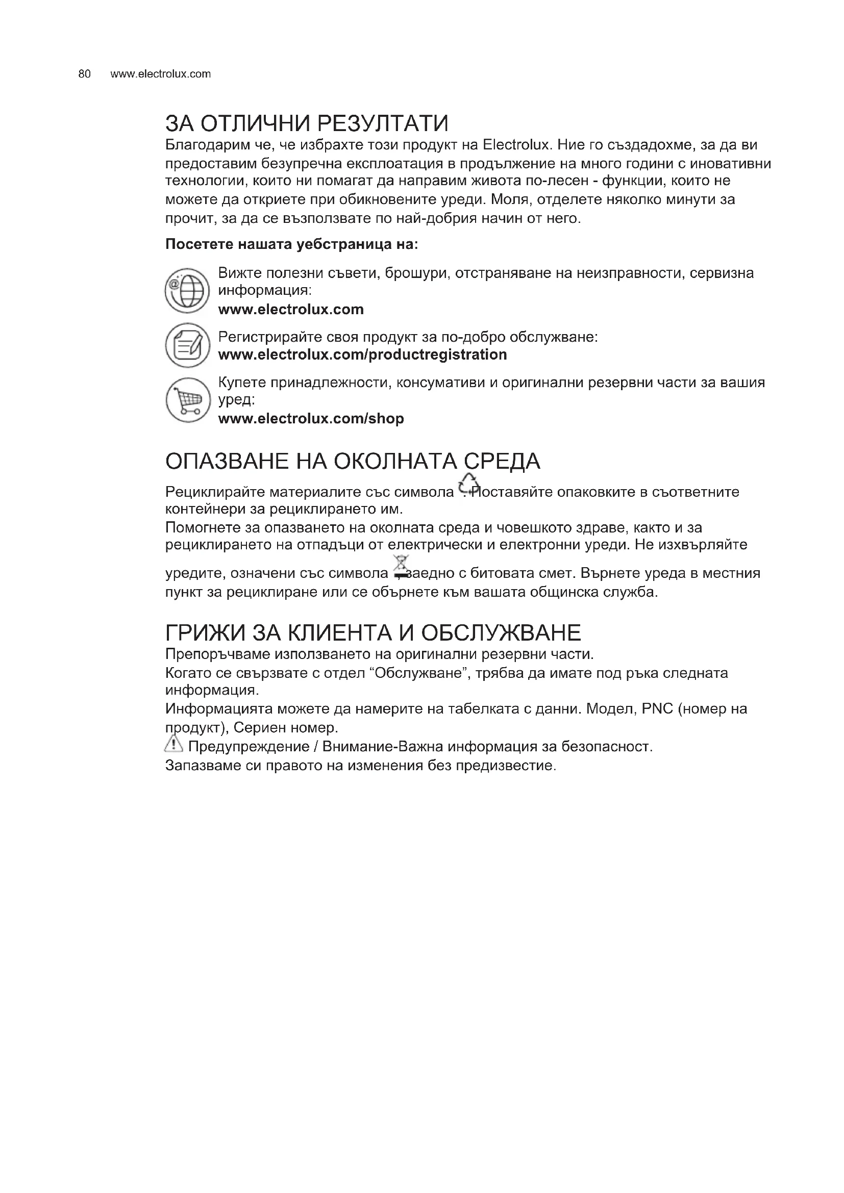 ЗА ОТЛИЧНИ РЕЗУЛТАТИ Благодарим че, че избрахте този продукт на Electrolux. Ние го създадохме, за да ви предоставим безупречна експлоатация в продължение на много години с иновативни технологии, които ни помагат да направим живота по-лесен - функции, които не можете да откриете при обикновените уреди. Моля, отделете няколко минути за прочит, за да се възползвате по най-добрия начин от него. Посетете нашата уебстраница на: Вижте полезни съвети, брошури, отстраняване на неизправности, сервизна информация: www.electrolux.com Регистрирайте своя продукт за по-добро обслужване: www.electrolux.com/productregistration Купете принадлежности, консумативи и оригинални резервни части за вашия