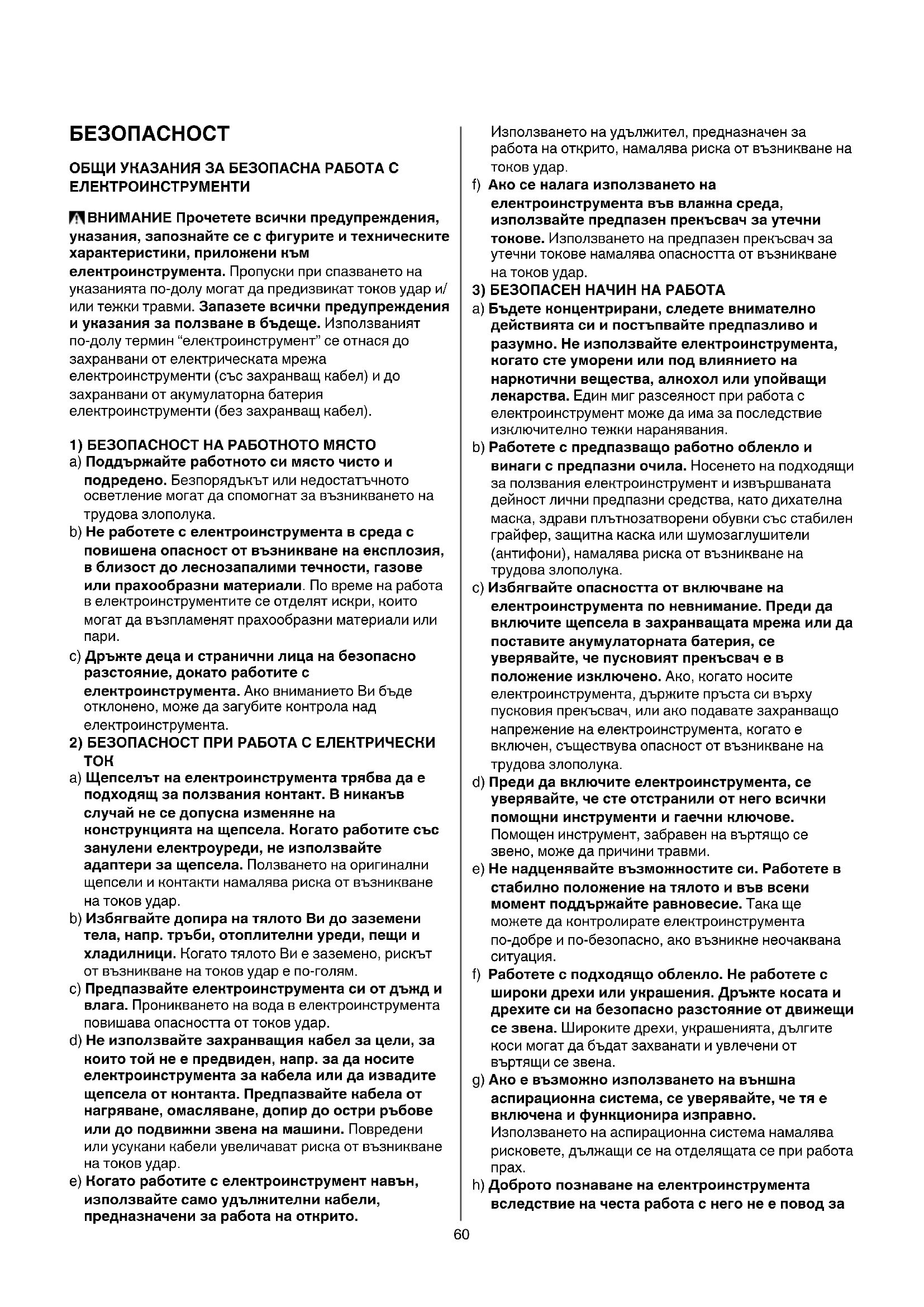 - Прочетете и пазете това ръководство за работа 3 ТЕXHИЧЕСКИ ДАННИ 1 ЕЛЕМЕНТИ НА ИНСТРУМЕНТА 2 A Адаптер за прахосмукачка B Прекъсвач за включване/изключване C Вентилационните отвоpи60 БЕЗОПАСНОСТ ОБЩИ УКАЗАНИЯ ЗА БЕЗОПАСНА РАБОТА С ЕЛЕКТРОИНСТРУМЕНТИ ВНИМАНИЕ Прочетете всички предупреждения, указания, запознайте се с фигурите и техническите характеристики, приложени към електроинструмента. Пропуски при спазването на указанията по-долу могат да предизвикат токов удар и/ или тежки травми. Запазете всички предупреждения и указания за ползване в бъдеще. Използваният по-долу термин “електроинструмент” се отнася до захранвани от електрическата мрежа електроинструменти (със захранващ кабел) и до захранвани от акумулаторна батерия електроинструменти (без захранващ кабел).