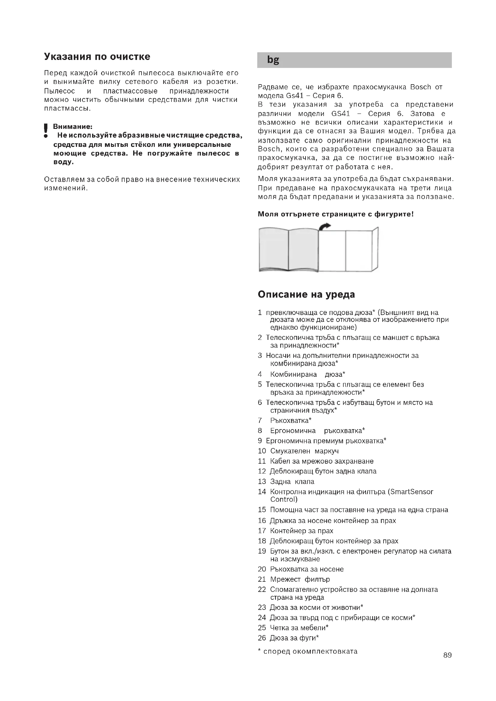 - според окомплектовката Радваме се, че избрахте прахосмукачка Bosch от модела Gs41 – Серия 6. В тези указания за употреба са представени различни модели GS41 – Серия 6. Затова е възможно не всички описани характеристики и функции да се отнасят за Вашия модел. Трябва да използвате само оригинални принадлежности на Bosch, които са разработени специално за Вашата прахосмукачка, за да се постигне възможно най- добрият резултат от работата с нея. Моля указанията за употреба да бъдат съхранявани. При предаване на прахосмукачката на трети лица моля да бъдат предавани и указанията за ползване. Моля отгърнете страниците с фигурите! Описание на уреда 1 превключваща се подова дюза* (Външният вид на дюзата може да се отклонява от изображението при еднакво функциониране) 2 Телескопична тръба с плъзгащ се маншет с връзка за принадлежности* 3 Носачи на допълнителни принадлежности за комбинирана дюза* 4 Комбинирана дюза* 5 Телескопична тръба с плъзгащ се елемент без връзка за принадлежности* 6 Телескопична тръба с избутващ бутон и място на страничния въздух* 7 Ръкохватка* 8 Ергономична ръкохватка* 9 Ергономична премиум ръкохватка* 10 Смукателен маркуч 11 Кабел за мрежово захранване 12 Деблокиращ бутон задна клапа 13 Задна клапа 14 Контролна индикация на филтъра (SmartSensor Control) 15 Помощна част за поставяне на уреда на една страна 16 Дръжка за носене контейнер за прах 17 Контейнер за прах 18 Деблокиращ бутон контейнер за прах 19 Бутон за вкл./изкл. с електронен регулатор на силата на изсмукване 20 Ръкохватка за носене 21 Мрежест филтър 22 Спомагателно устройство за оставяне на долната страна на уреда 23 Дюза за косми от животни* 24 Дюза за твърд под с прибиращи се косми* 25 Четка за мебели* 26 Дюза за фуги*90
