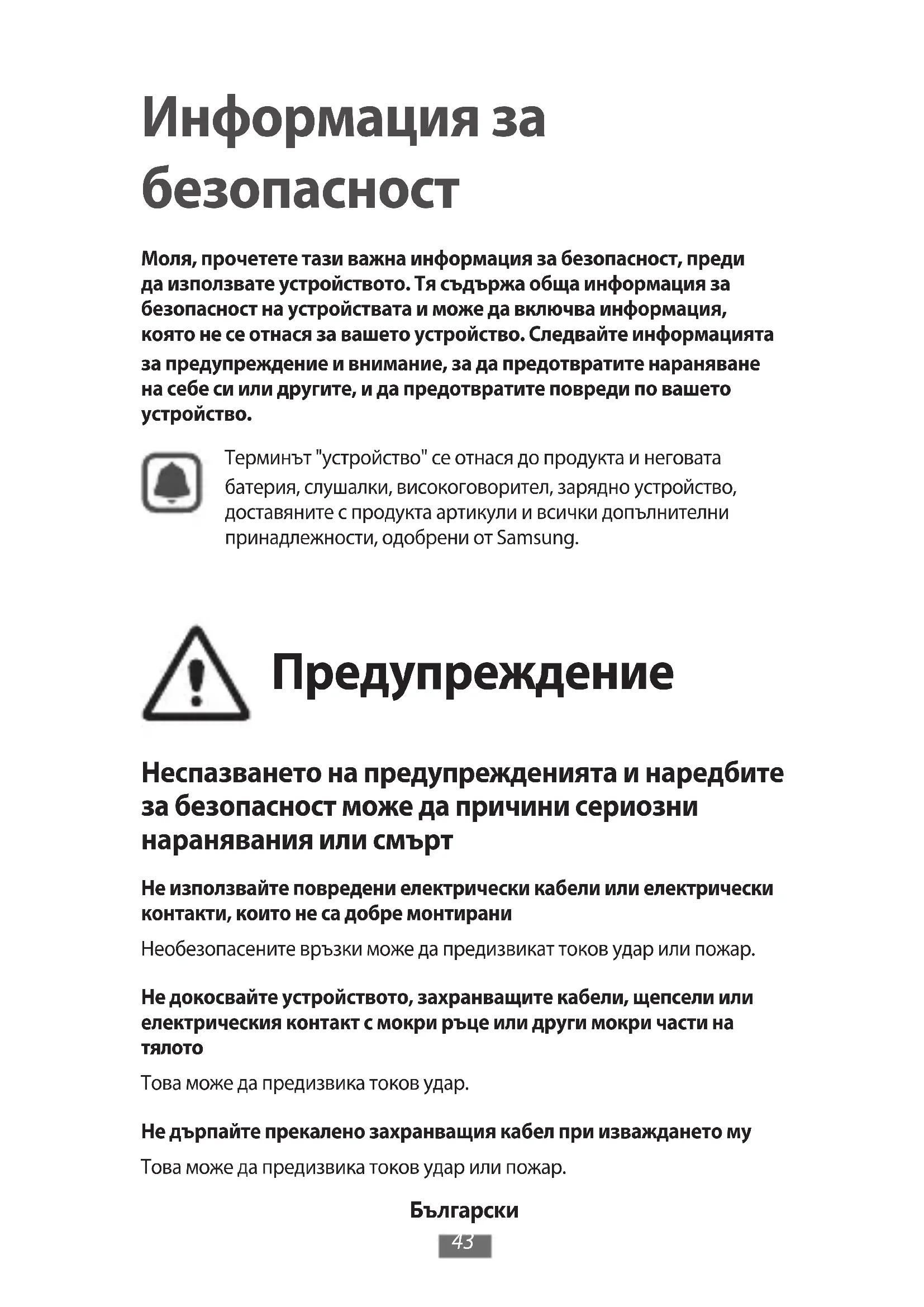 Информация за безопасност Моля, прочетете тази важна информация за безопасност, преди да използвате устройството. Тя съдържа обща информация за безопасност на устройствата и може да включва информация, която не се отнася за вашето устройство. Следвайте информацията за предупреждение и внимание, за да предотвратите нараняване на себе си или другите, и да предотвратите повреди по вашето устройство.Терминът "устройство" се отнася до продукта и неговата батерия, слушалки, високоговорител, зарядно устройство, доставяните с продукта артикули и всички допълнителни принадлежности, одобрени от Samsung. Предупреждение Неспазването на предупрежденията и наредбите за безопасност може да причини сериозни наранявания или смърт Не използвайте повредени електрически кабели или електрически контакти, които не са добре монтираниНеобезопасените връзки може да предизвикат токов удар или пожар.Не докосвайте устройството, захранващите кабели, щепсели или електрическия контакт с мокри ръце или други мокри части на тялотоТова може да предизвика токов удар.Не дърпайте прекалено захранващия кабел при изваждането муТова може да предизвика токов удар или пожар.Български
