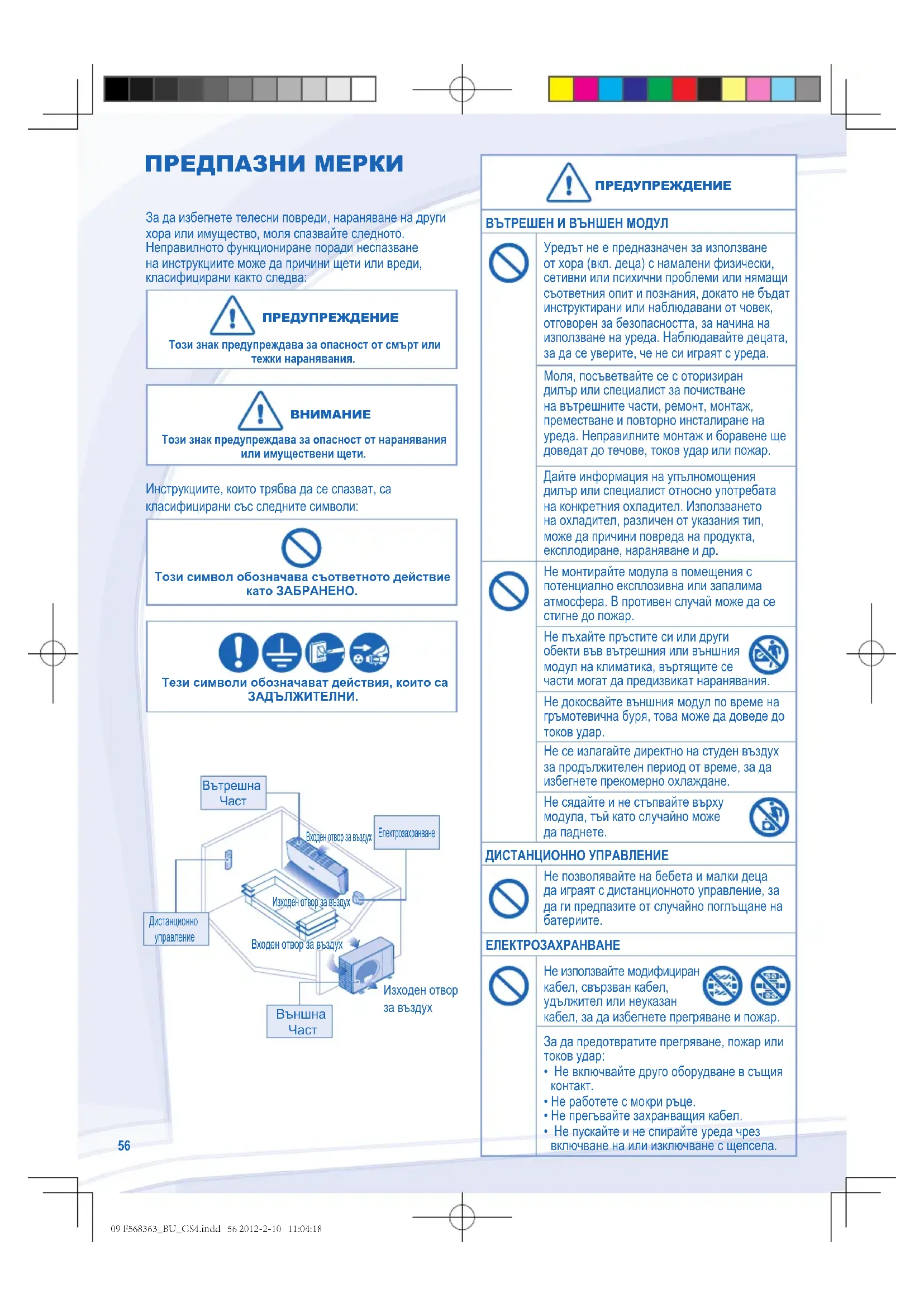 Този знак предупреждава за опасност от наранявания или имуществени щети. Инструкциите, които трябва да се спазват, са класифицирани със следните символи: Този символ обозначава съответното действие като ЗАБРАНЕНО. Тези символи обозначават действия, които са ЗАДЪЛЖИТЕЛНИ. ПРЕДУПРЕЖДЕНИЕ ВЪТРЕШЕН И ВЪНШЕН МОДУЛ Уредът не е предназначен за използване от хора (вкл. деца) с намалени физически, сетивни или психични проблеми или нямащи съответния опит и познания, докато не бъдат инструктирани или наблюдавани от човек, отговорен за безопасността, за начина на използване на уреда. Наблюдавайте децата, за да се уверите, че не си играят с уреда. Моля, посъветвайте се с оторизиран дилър или специалист за почистване на вътрешните части, ремонт, монтаж, преместване и повторно инсталиране на уреда. Неправилните монтаж и боравене ще доведат до течове, токов удар или пожар. Дайте информация на упълномощения дилър или специалист относно употребата на конкретния охладител. Използването на охладител, различен от указания тип, може да причини повреда на продукта, експлодиране, нараняване и др. Не монтирайте модула в помещения с потенциално експлозивна или запалима атмосфера. В противен случай може да се стигне до пожар. Не пъхайте пръстите си или други обекти във вътрешния или външния модул на климатика, въртящите се части могат да предизвикат наранявания. Не докосвайте външния модул по време на гръмотевична буря, това може да доведе до токов удар. Не се излагайте директно на студен въздух за продължителен период от време, за да избегнете прекомерно охлаждане. Не сядайте и не стъпвайте върху модула, тъй като случайно може да паднете. ДИСТАНЦИОННО УПРАВЛЕНИЕ Не позволявайте на бебета и малки деца да играят с дистанционното управление, за да ги предпазите от случайно поглъщане на