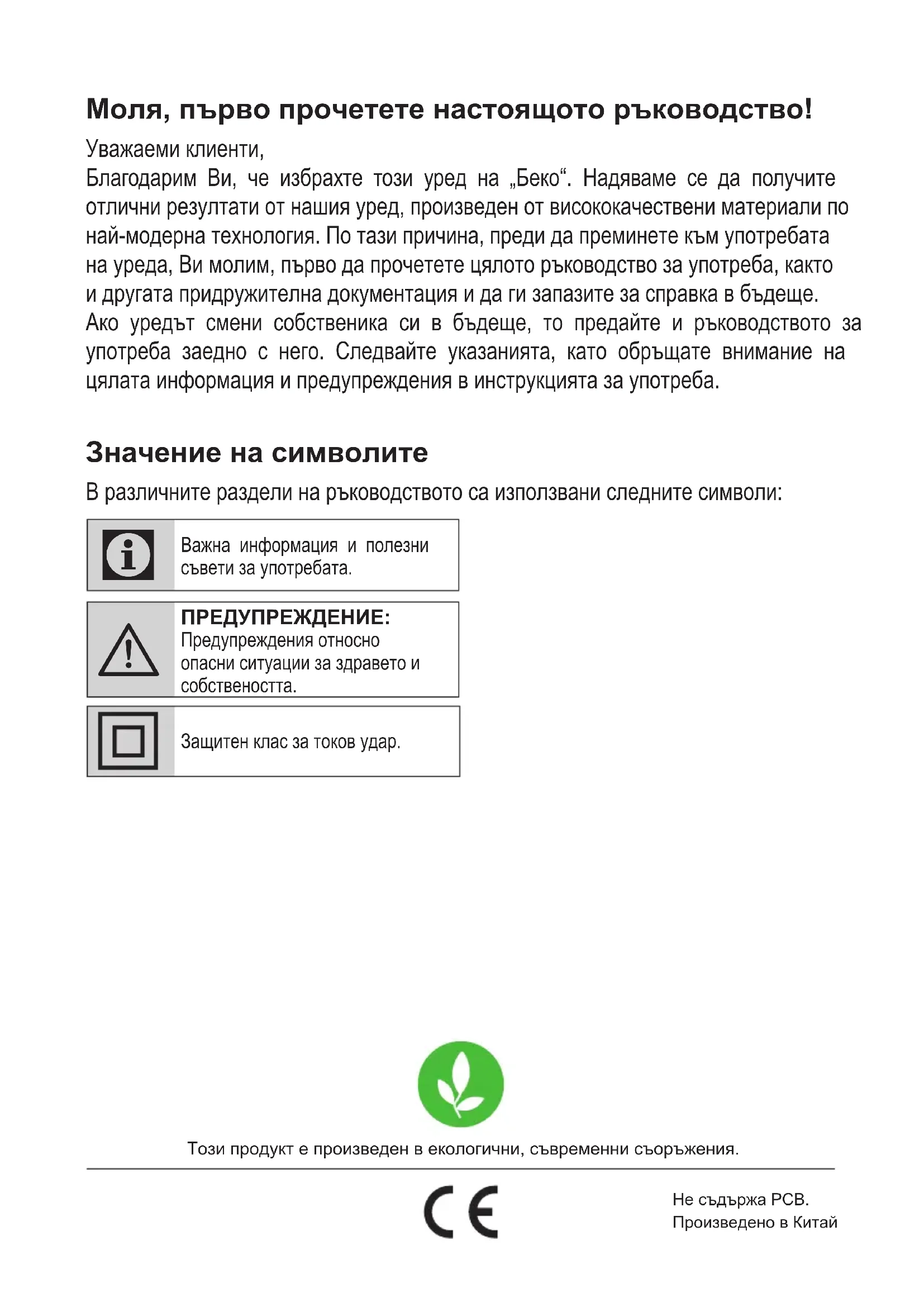 - Pokud spotřebič spadne, může přestat fungovat nebo se může vyskytnout trvalé poškození. 4 Čištění a péčeМоля, първо прочетете настоящото ръководство! Уважаеми клиенти, Благодарим Ви, че избрахте този уред на „Беко“. Надяваме се да получите отлични резултати от нашия уред, произведен от висококачествени материали по най-модерна технология. По тази причина, преди да преминете към употребата на уреда, Ви молим, първо да прочетете цялото ръководство за употреба, както и другата придружителна документация и да ги запазите за справка в бъдеще. Ако уредът смени собственика си в бъдеще, то предайте и ръководството за употреба заедно с него. Следвайте указанията, като обръщате внимание на цялата информация и предупреждения в инструкцията за употреба. Значение на символите В различните раздели на ръководството са използвани следните символи: