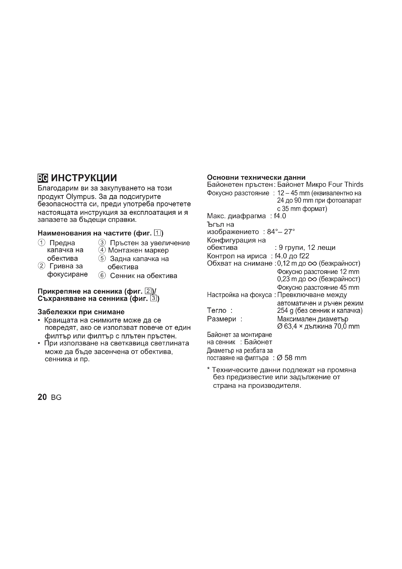 - Не насочвайте обектива на фотоапарата към слънцето. Снопът слънчеви лъчи през обектива ще се фокусира във фотоапарата и може да причини неизправност или пожар. Micro Four Thirds и логото на Micro Four Thirds са търговски марки или регистрирани търговски марки на OLYMPUS CORPORATION.22 BG Софтуерът в този обектив може да включва софтуер, собственост на трета страна. Всеки софтуер, собственост на трета страна, е предмет на условията, наложени от собствениците или лицензодателите на този софтуер, и при които софтуерът ви се предоставя. Тези условия, както и други забележки по отношение на притежавания от трети страни софтуер, ако има такива, могат да бъдат намерени в PDF файла за софтуера,
