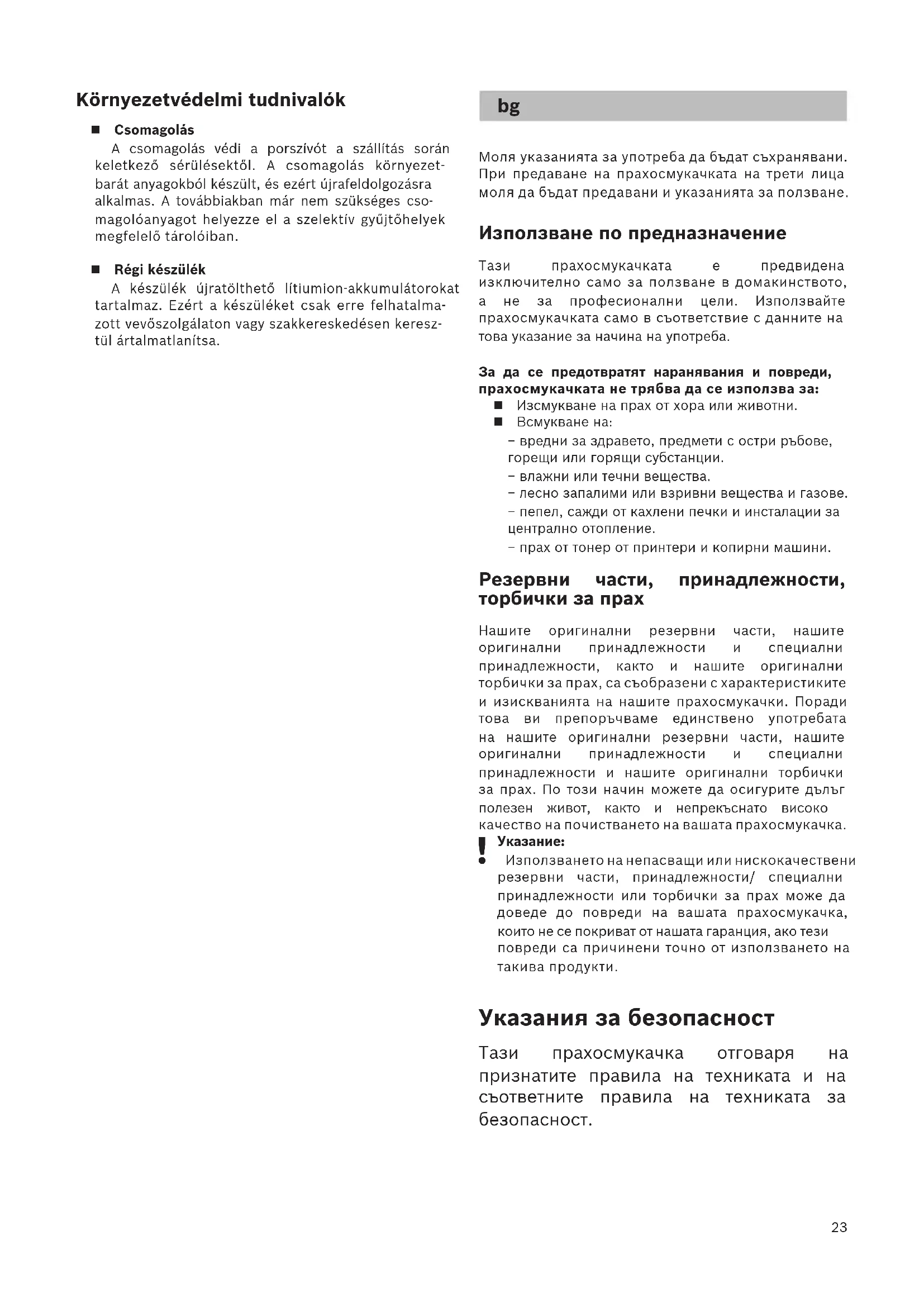 Използването на непасващи или нискокачествени резервни части, принадлежности/ специални принадлежности или торбички за прах може да доведе до повреди на вашата прахосмукачка, които не се покриват от нашата гаранция, ако тези повреди са причинени точно от използването на такива продукти. Указания за безопасност Тази прахосмукачка отговаря на признатите правила на техниката и на съответните правила на техниката за безопасност. bg24 Уредът може да се ползва от деца на повече от 8 години и от лица с намалени физически, сетивни или умствени способности или липса на опит и / или знания, ако те биват контролирани или са инструктирани относно безопасната употреба на уреда и са разбрали произтичащите вследствие на това