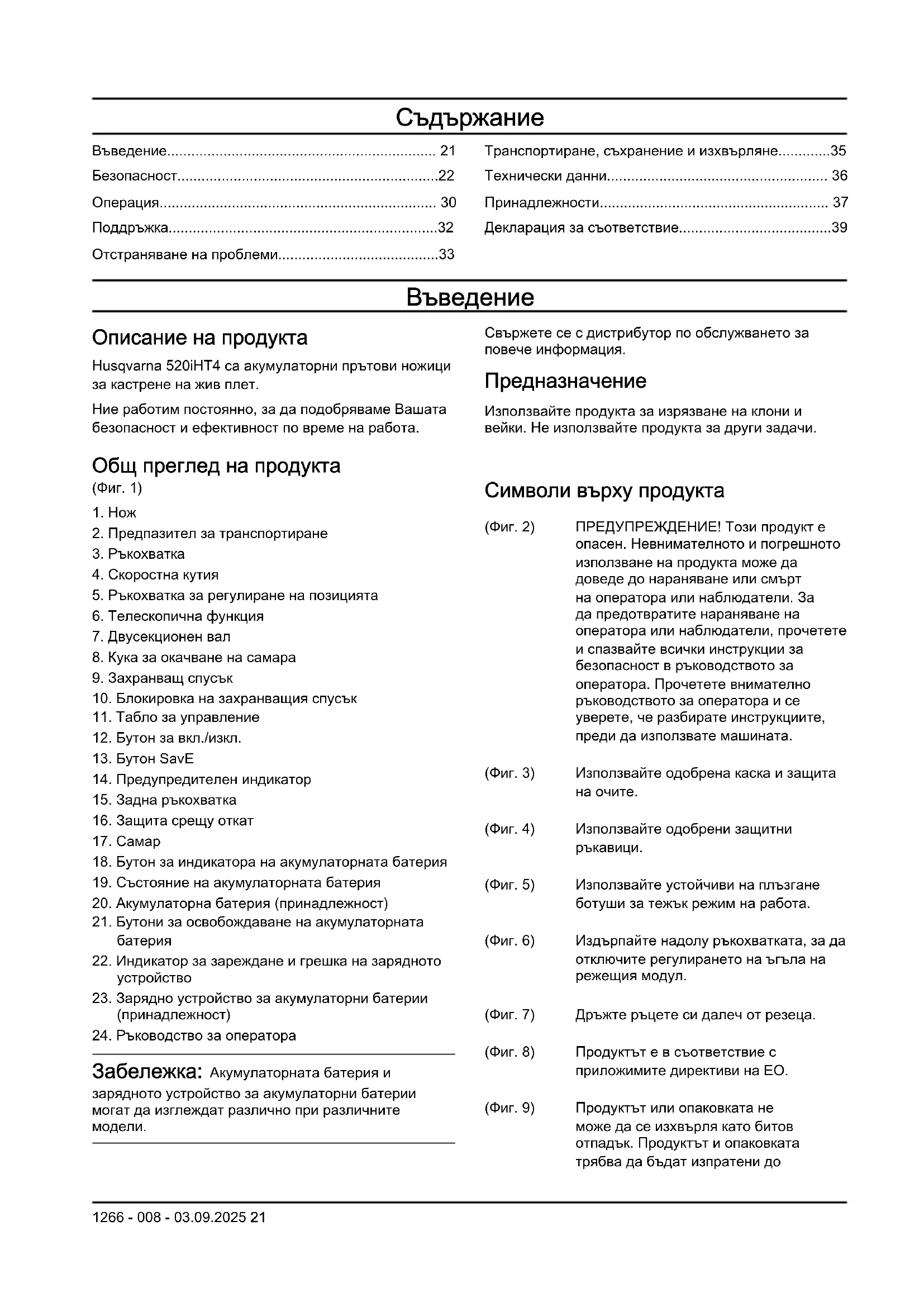 Описание на продукта Husqvarna 520iHT4 са акумулаторни прътови ножици за кастрене на жив плет. Ние работим постоянно, за да подобряваме Вашата безопасност и ефективност по време на работа. Свържете се с дистрибутор по обслужването за повече информация. Предназначение Използвайте продукта за изрязване на клони и вейки. Не използвайте продукта за други задачи. Общ преглед на продукта (Фиг. 1)