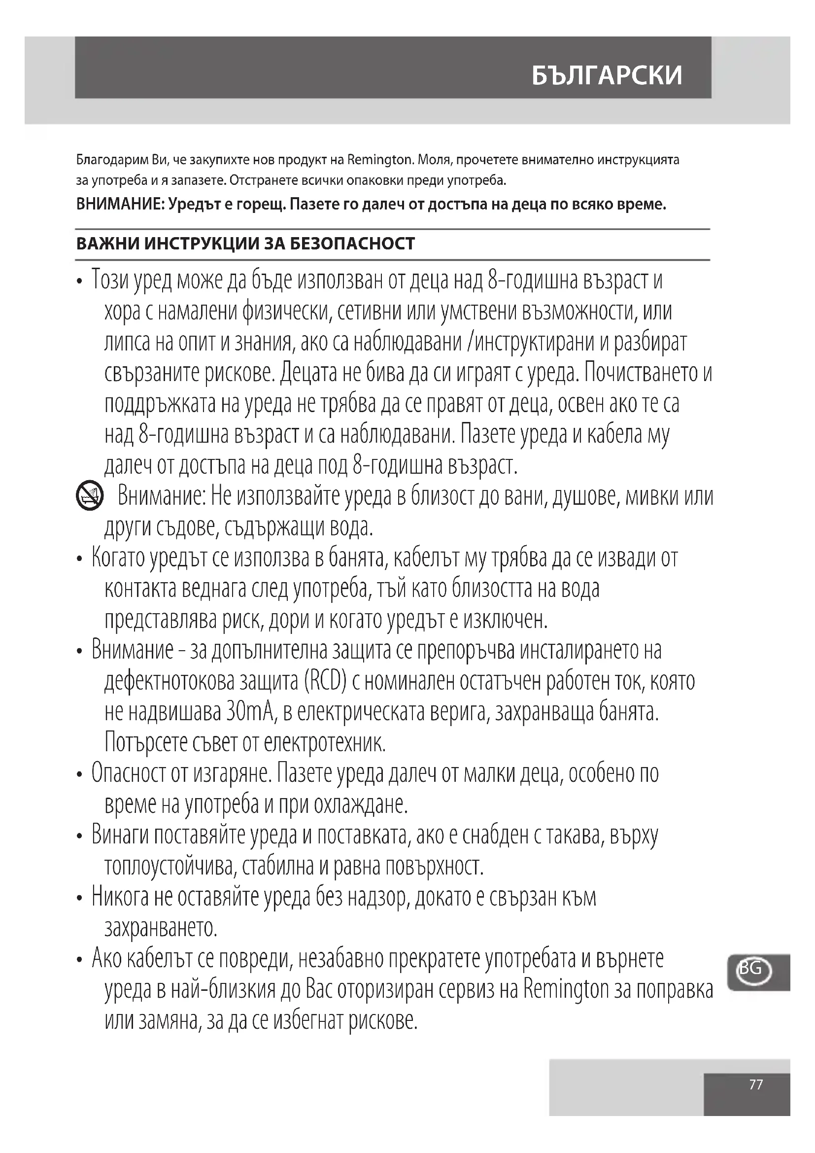 Благодарим Ви, че закупихте нов продукт на Remington. Моля, прочетете внимателно инструкцията за употреба и я запазете. Отстранете всички опаковки преди употреба. ВНИМАНИЕ: Уредът е горещ. Пазете го далеч от достъпа на деца по всяко време. ВАЖНИ ИНСТРУКЦИИ ЗА БЕЗОПАСНОСТ