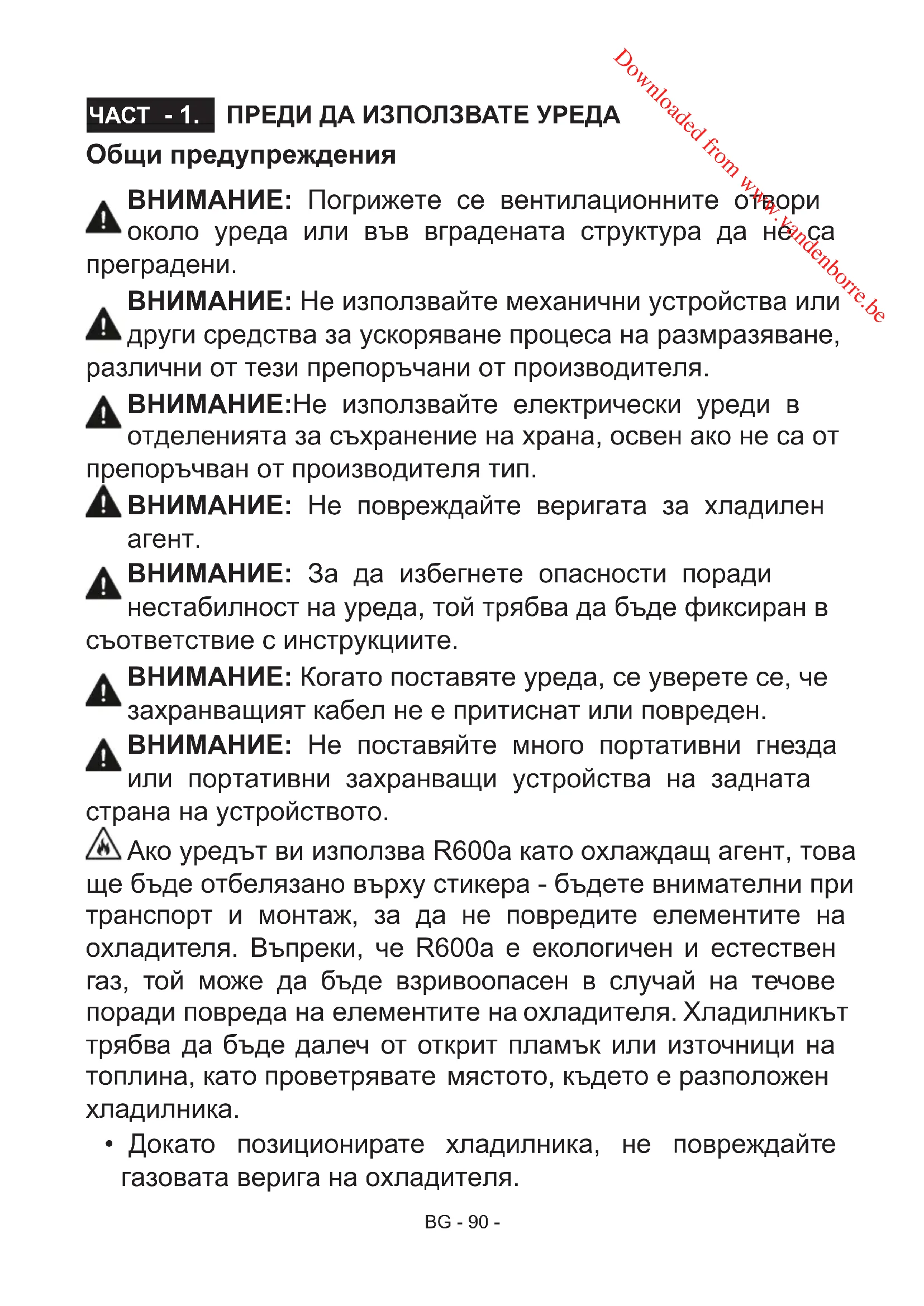 - Докато позиционирате хладилника, не повреждайте газовата верига на охладителя. ПРЕДИ ДА ИЗПОЛЗВАТЕ УРЕДАЧАСТ - 1. Downloaded from www.vandenborre.beBG - 91 -