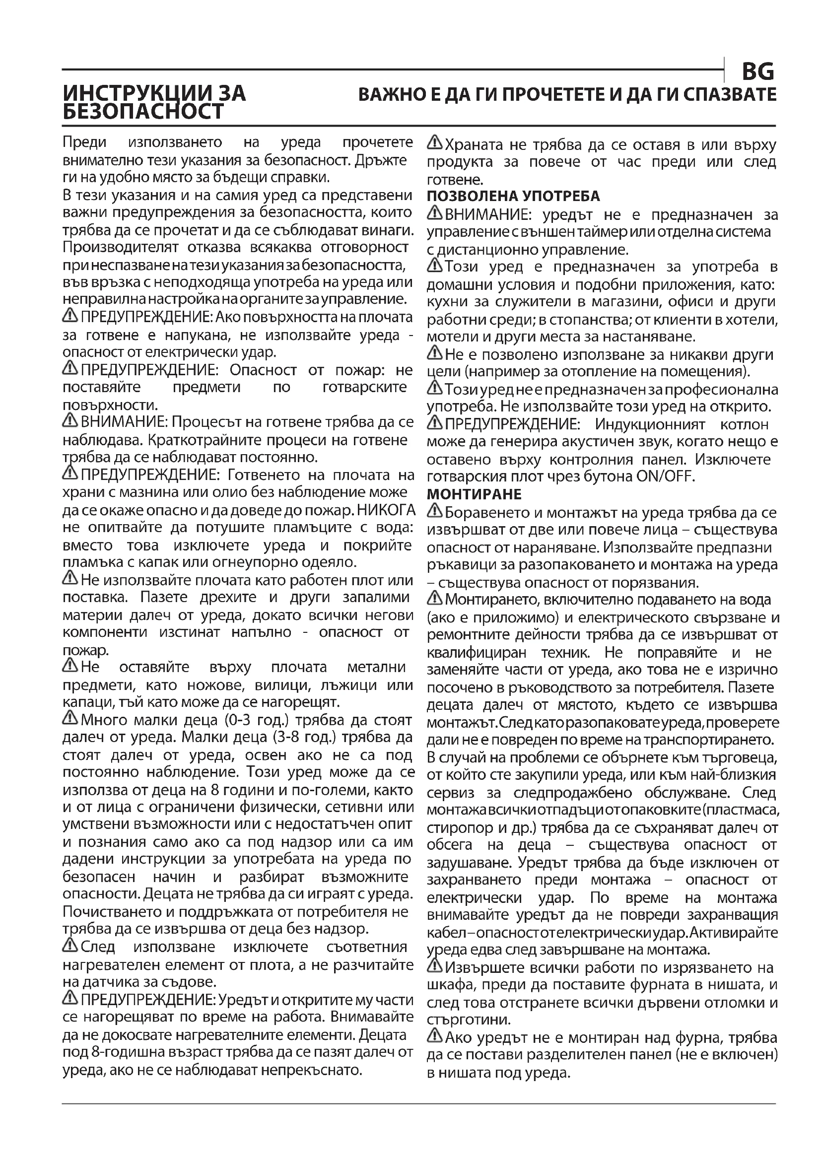 Боравенето и монтажът на уреда трябва да се извършват от две или повече лица – съществува опасност от нараняване. Използвайте предпазни ръкавици за разопаковането и монтажа на уреда – съществува опасност от порязвания. Монтирането, включително подаването на вода (ако е приложимо) и електрическото свързване и ремонтните дейности трябва да се извършват от квалифициран техник. Не поправяйте и не заменяйте части от уреда, ако това не е изрично посочено в ръководството за потребителя. Пазете децата далеч от мястото, където се извършва монтажът. След като разопаковате уреда, проверете дали не е повреден по време на транспортирането. В случай на проблеми се обърнете към търговеца, от който сте закупили уреда, или към най-близкия сервиз за следпродажбено обслужване. След монтажа всички отпадъци от опаковките (пластмаса, стиропор и др.) трябва да се съхраняват далеч от обсега на деца – съществува опасност от задушаване. Уредът трябва да бъде изключен от захранването преди монтажа – опасност от електрически удар. По време на монтажа внимавайте уредът да не повреди захранващия кабел – опасност от електрически удар. Активирайте уреда едва след завършване на монтажа. Извършете всички работи по изрязването на шкафа, преди да поставите фурната в нишата, и след това отстранете всички дървени отломки и стърготини. Ако уредът не е монтиран над фурна, трябва да се постави разделителен панел (не е включен) в нишата под уреда. ИНСТРУКЦИИ ЗА БЕЗОПАСНОСТ ВАЖНО Е ДА ГИ ПРОЧЕТЕТЕ И ДА ГИ СПАЗВАТЕ BGПРЕДУПРЕЖДЕНИЯ ОТНОСНО ЕЛЕКТРОЗАХРАНВАНЕТО Трябва да е възможно уредът да се изключи от захранването чрез изваждане на щепсела, ако е достъпен, или чрез достъпен многополюсен превключвател, монтиран след контакта, както и уредът да е заземен в съответствие с националните стандарти за електрическа безопасност. Не използвайте удължители, разклонители с няколко гнез да или адаптери. С лед инс талирането електрическите компоненти трябва да бъдат достъпни за потребителя. Не използвайте уреда, когато сте с мокри или боси крака. Не използвайте този уред, ако захранващият му кабел или щепсел е повреден, ако не работи правилно или ако е бил повреден или е падал. Инсталирането с използване на захранващ кабел с щепсел не се разрешава, освен ако уредът оригинално не е вече оборудван с такъв от производителя. Ако захранващият кабел е повреден, той трябва да се смени от производителя, негов сервизен агент или лице с аналогична квалификация, за да се избегне опасна ситуация, например електрически