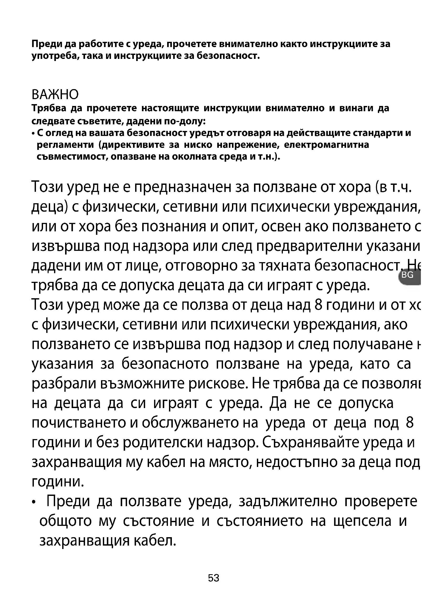 - Преди да ползвате уреда, задължително проверете общото му състояние и състоянието на щепсела и захранващия кабел. BG54