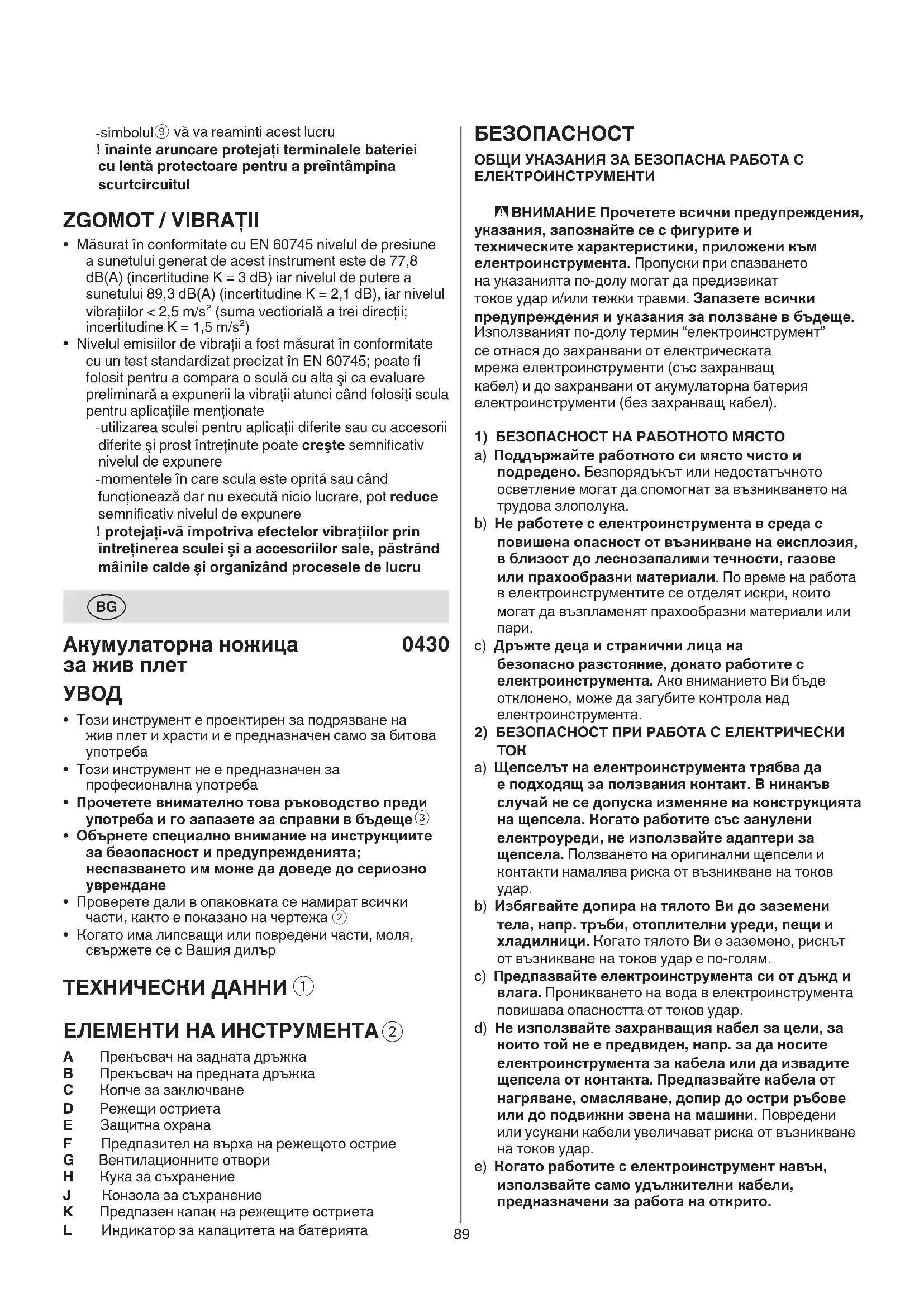 - Ascuţirea lamelor de tăiere ! scoateţi bateria din sculă - ascuţiţi lamele de tăiere cu o pilă mică şi netedă în cazul în care acestea au fost deteriorate de un obiect solid - totuşi, vă recomandăm ca ascuţirea lamelor să e efectuată de un specialist - ungeţi lamele de tăiere după ascuţire89 БЕЗОПАСНОСТ ОБЩИ УКАЗАНИЯ ЗА БЕЗОПАСНА РАБОТА С ЕЛЕКТРОИНСТРУМЕНТИ - ВНИМАНИЕ Прочетете всички предупреждения, указания, запознайте се с фигурите и техническите характеристики, приложени към електроинструмента. Пропуски при спазването на указанията по-долу могат да предизвикат токов удар и/или тежки травми. Запазете всички предупреждения и указания за ползване в бъдеще. Използваният по-долу термин “електроинструмент” се отнася до захранвани от електрическата мрежа електроинструменти (със захранващ кабел) и до захранвани от акумулаторна батерия електроинструменти (без захранващ кабел).