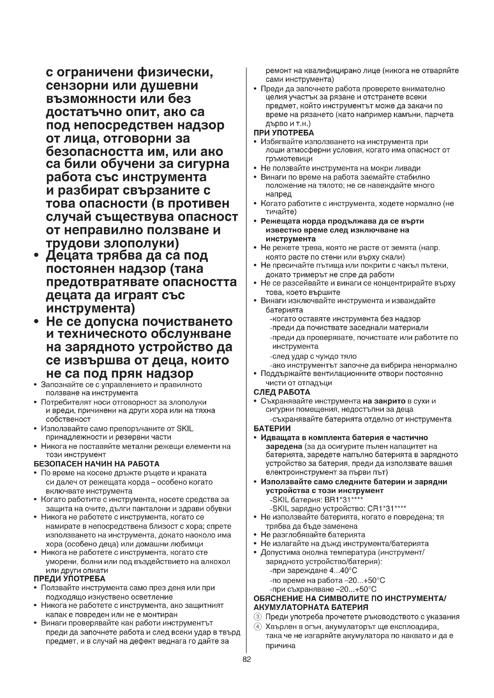 - Използвайте само следните батерии и зарядни устройства с този инструмент - SKIL батерия: BR1*31**** - SKIL зарядно устройство: CR1*31****