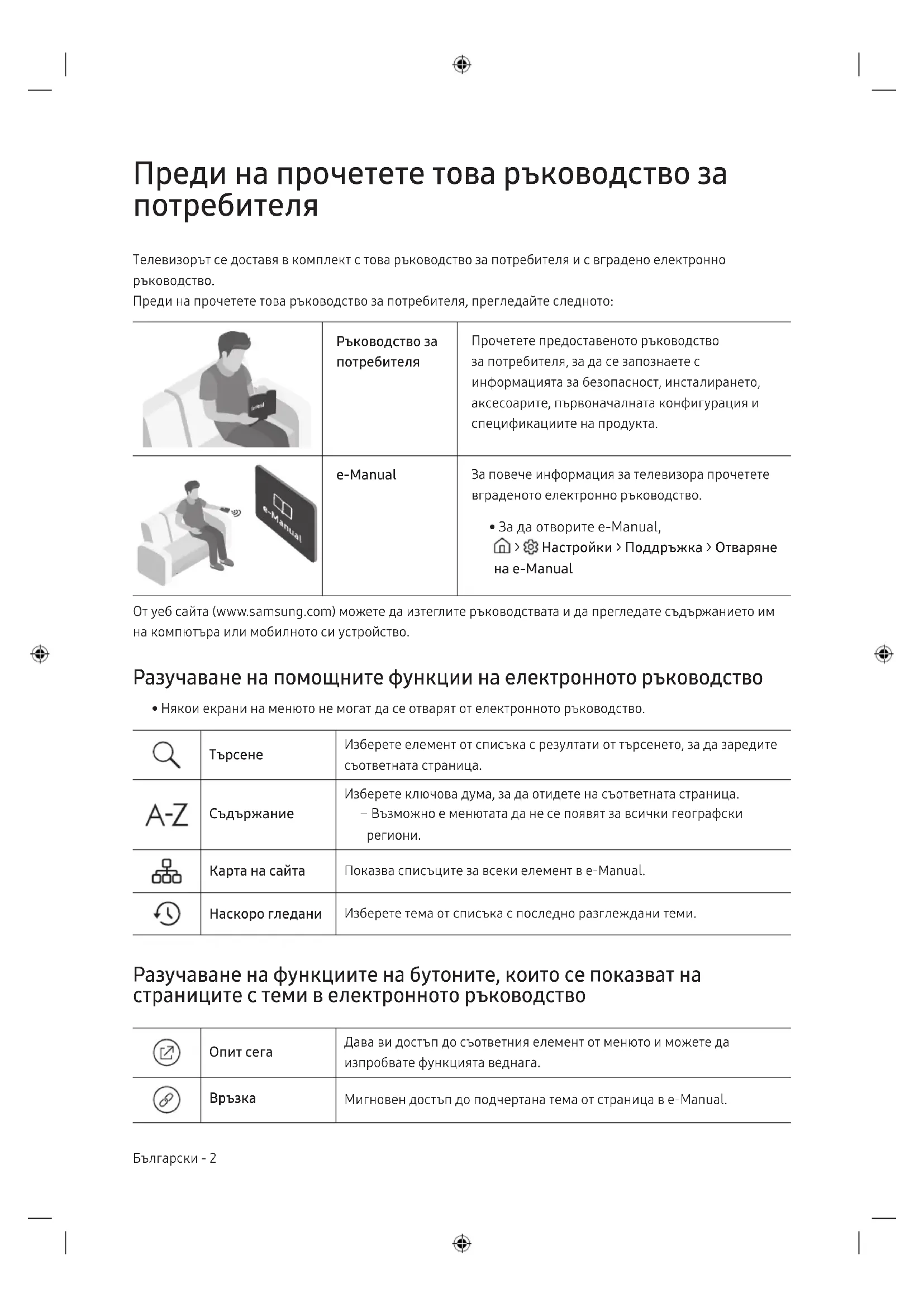 - За да отворите e-Manual, > Настройки > Поддръжка > Отваряне на e-Manual От уеб сайта (www.samsung.com) можете да изтеглите ръководствата и да прегледате съдържанието им на компютъра или мобилното си устройство. Разучаване на помощните функции на електронното ръководство