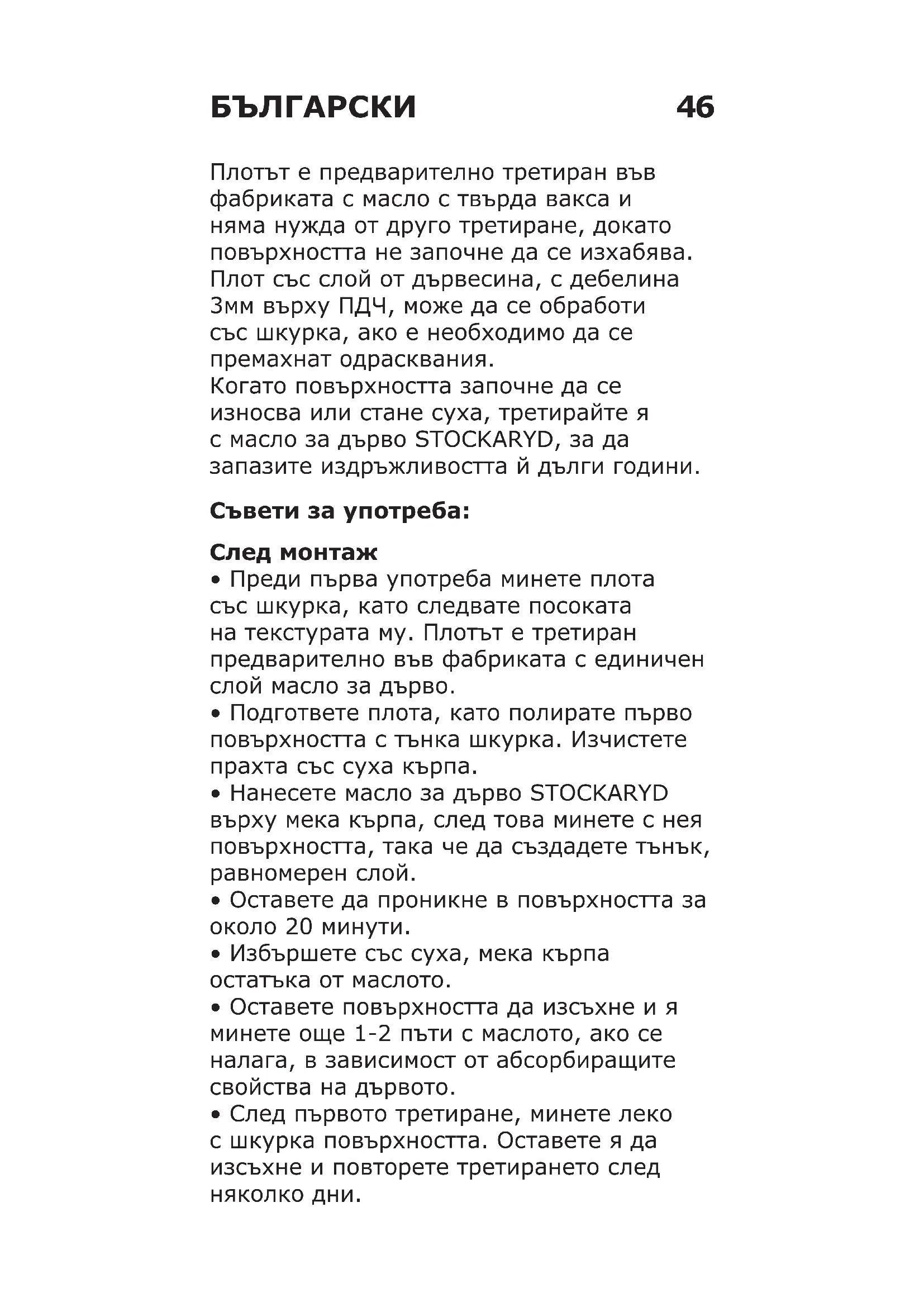- Na čistenie nikdy nepoužívajte oceľovú drôtenku či čistiace prostriedky s kyselinami alebo podobné výrobky, pretože môžu poškriabať povrch. UPOZORNENIE Akúkoľvek tkaninu, ktorá je nasiaknutá týmto produktom hneď po použití namočte do vody alebo uzavrite do vzduchotesného obalu, aby ste predišli riziku samovznietenia.46 Плотът е предварително третиран във фабриката с масло с твърда вакса и няма нужда от друго третиране, докато повърхността не започне да се изхабява. Плот със слой от дървесина, с дебелина 3мм върху ПДЧ, може да се обработи със шкурка, ако е необходимо да се премахнат одрасквания. Когато повърхността започне да се износва или стане суха, третирайте я с масло за дърво STOCKARYD, за да запазите издръжливостта й дълги години. Съветизаупотреба: