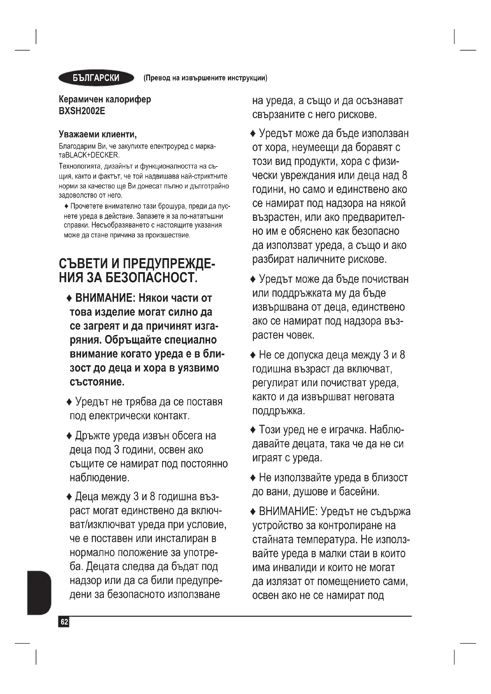 Керамичен калорифер BXSH2002E Уважаеми клиенти, Благодарим Ви, че закупихте електроуред с марка- таBLACK+DECKER. Технологията, дизайнът и функционалността на съ- щия, както и фактът, че той надвишава най-стриктните норми за качество ще Ви донесат пълно и дълготрайно задоволство от него. ♦ Прочетете внимателно тази брошура, преди да пус- нете уреда в действие. Запазете я за по-нататъшни справки. Несъобразяването с настоящите указания може да стане причина за произшествие. СЪВЕТИ И ПРЕДУПРЕЖДЕ- НИЯ ЗА БЕЗОПАСНОСТ. ♦ ВНИМАНИЕ: Някои части от това изделие могат силно да се загреят и да причинят изга- ряния. Обръщайте специално внимание когато уреда е в бли- зост до деца и хора в уязвимо