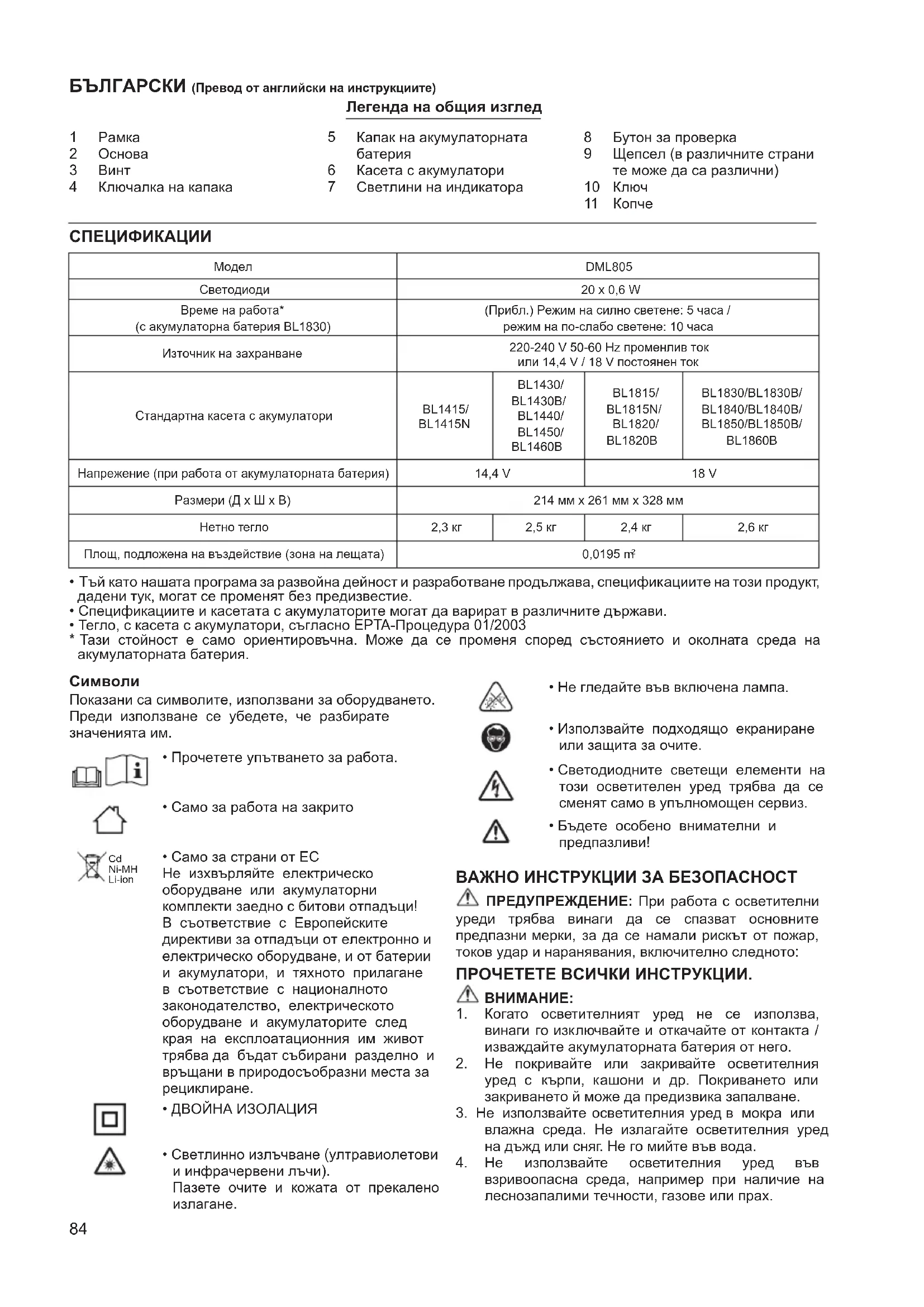 DML805 - фенерче MAKITA - Безплатно ръководство за потребителя