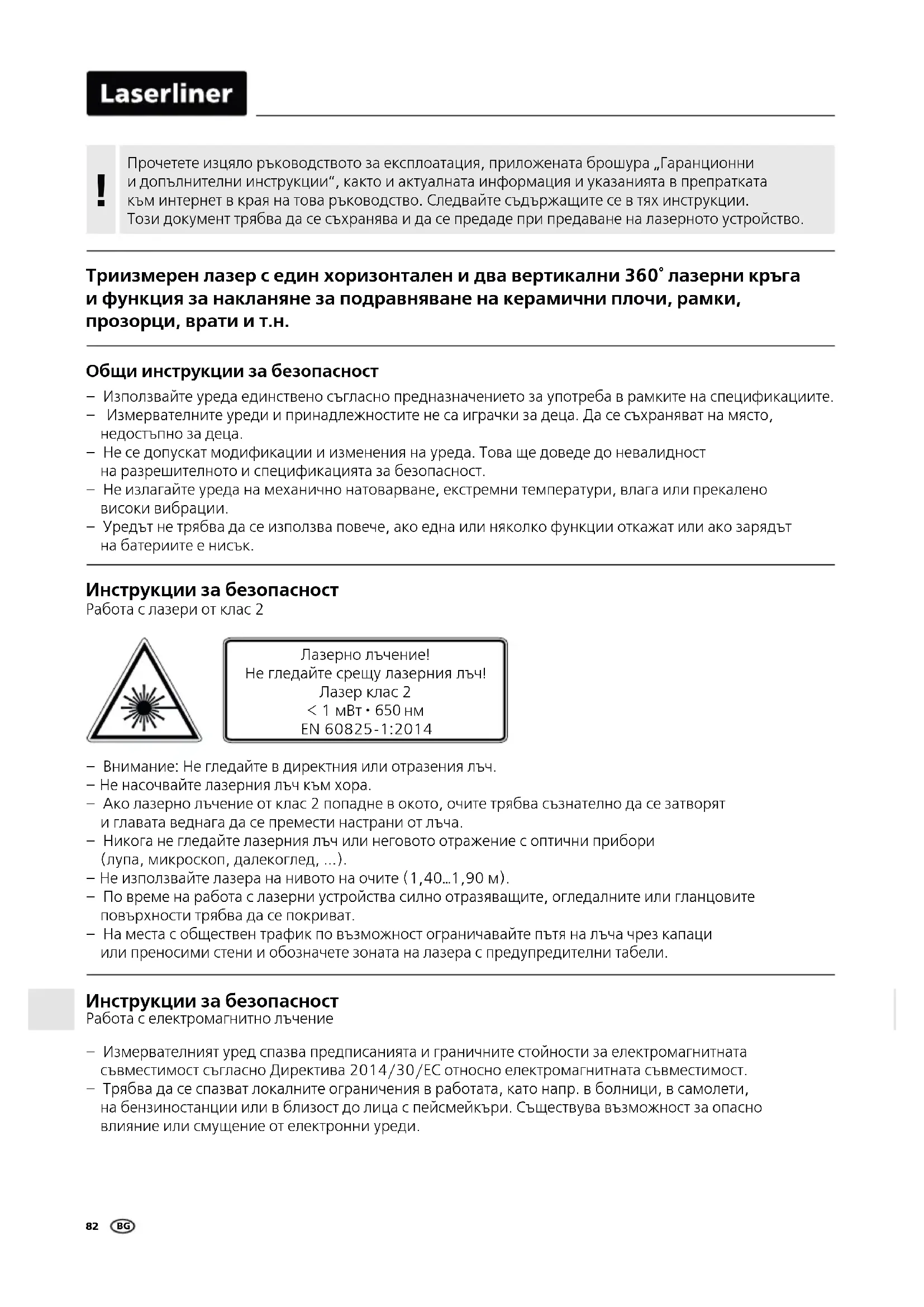 RO82 – Измервателният уред спазва предписанията и граничните стойности за електромагнитната съвместимост съгласно Директива 2014/30/ЕС относно електромагнитната съвместимост. – Трябва да се спазват локалните ограничения в работата, като напр. в болници, в самолети, на бензиностанции или в близост до лица с пейсмейкъри. Съществува възможност за опасно влияние или смущение от електронни уреди. Инструкции за безопасност Работа с електромагнитно лъчение – Внимание: Не гледайте в директния или отразения лъч. – Не насочвайте лазерния лъч към хора. – Ако лазерно лъчение от клас 2 попадне в окото, очите трябва съзнателно да се затворят и главата веднага да се премести настрани от лъча. – Никога не гледайте лазерния лъч или неговото отражение с оптични прибори (лупа, микроскоп, далекоглед, ...). – Не използвайте лазера на нивото на очите (1,40…1,90 м). – По време на работа с лазерни устройства силно отразяващите, огледалните или гланцовите повърхности трябва да се покриват. – На места с обществен трафик по възможност ограничавайте пътя на лъча чрез капаци или преносими стени и обозначете зоната на лазера с предупредителни табели. Инструкции за безопасност Работа с лазери от клас 2 Общи инструкции за безопасност – Използвайте уреда единствено съгласно предназначението за употреба в рамките на спецификациите. – Измервателните уреди и принадлежностите не са играчки за деца. Да се съхраняват на място, недостъпно за деца. – Не се допускат модификации и изменения на уреда. Това ще доведе до невалидност на разрешителното и спецификацията за безопасност. – Не излагайте уреда на механично натоварване, екстремни температури, влага или прекалено високи вибрации. – Уредът не трябва да се използва повече, ако една или няколко функции откажат или ако зарядът на батериите е нисък. Триизмерен лазер с един хоризонтален и два вертикални 360° лазерни кръга и функция за накланяне за подравняване на керамични плочи, рамки, прозорци, врати и т.н. Прочетете изцяло ръководството за експлоатация, приложената брошура „Гаранционни и допълнителни инструкции“, както и актуалната информация и указанията в препратката към интернет в края на това ръководство. Следвайте съдържащите се в тях инструкции. Този документ трябва да се съхранява и да се предаде при предаване на лазерното устройство.