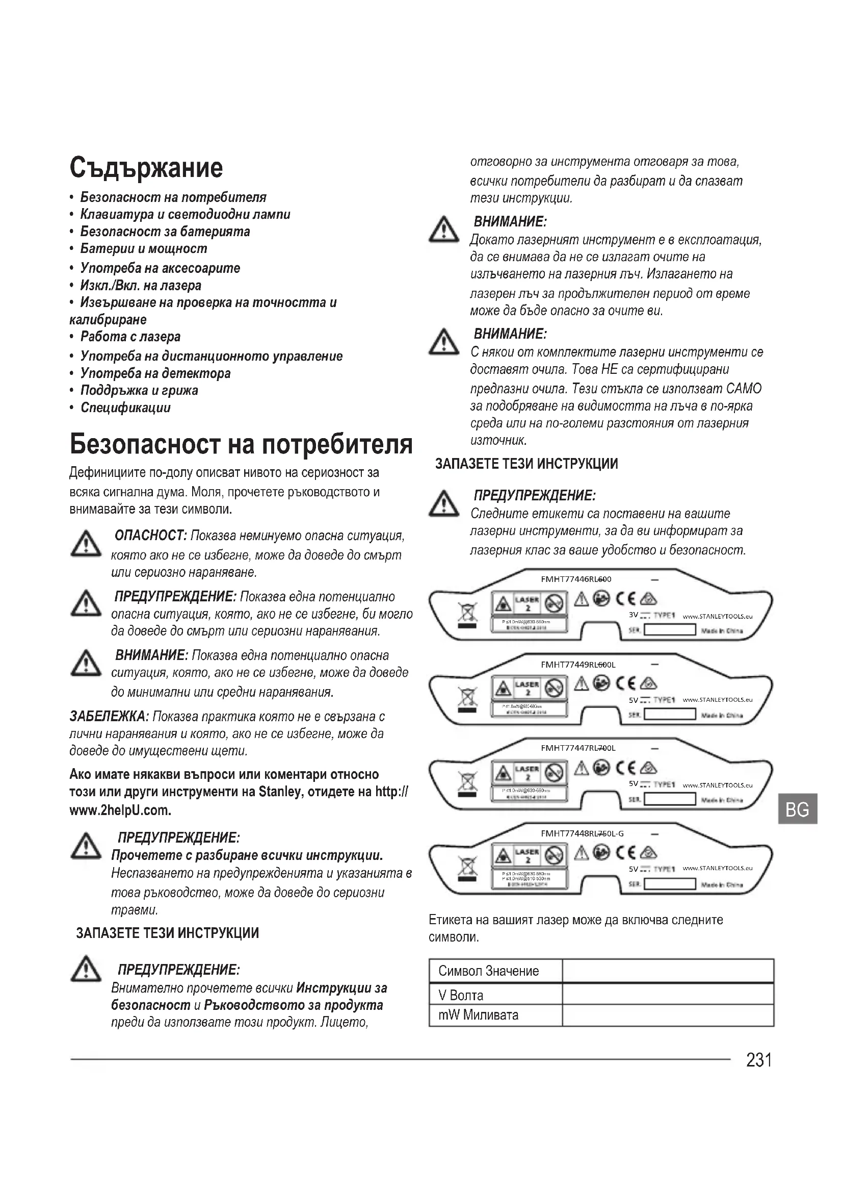 - Спецификации Безопасност на потребителя Дефинициите по-долу описват нивото на сериозност за всяка сигнална дума. Моля, прочетете ръководството и внимавайте за тези символи. ОПАСНОСТ: Показва неминуемо опасна ситуация, която ако не се избегне, може да доведе до смърт или сериозно нараняване. ПРЕДУПРЕЖДЕНИЕ: Показва една потенциално опасна ситуация, която, ако не се избегне, би могло да доведе до смърт или сериозни наранявания. ВНИМАНИЕ: Показва една потенциално опасна ситуация, която, ако не се избегне, може да доведе до минимални или средни наранявания. ЗАБЕЛЕЖКА: Показва практика която не е свързана с лични наранявания и която, ако не се избегне, може да доведе до имуществени щети. Ако имате някакви въпроси или коментари относно този или други инструменти на Stanley, отидете на http:// www.2helpU.com. ПРЕДУПРЕЖДЕНИЕ: Прочетете с разбиране всички инструкции. Неспазването на предупрежденията и указанията в това ръководство, може да доведе до сериозни