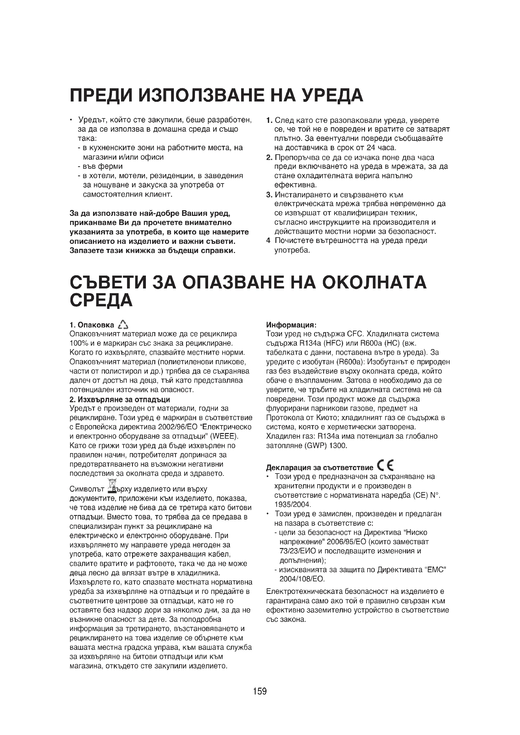 уверите, че тръбите на хладилната система не са повредени. Този продукт може да съдържа флуорирани парникови газове, предмет на Протокола от Киото; хладилният газ се съдържа в система, която е херметически затворена. Хладилен газ: R134a има потенциал за глобално затопляне (GWP) 1300. Декларация за съответствие