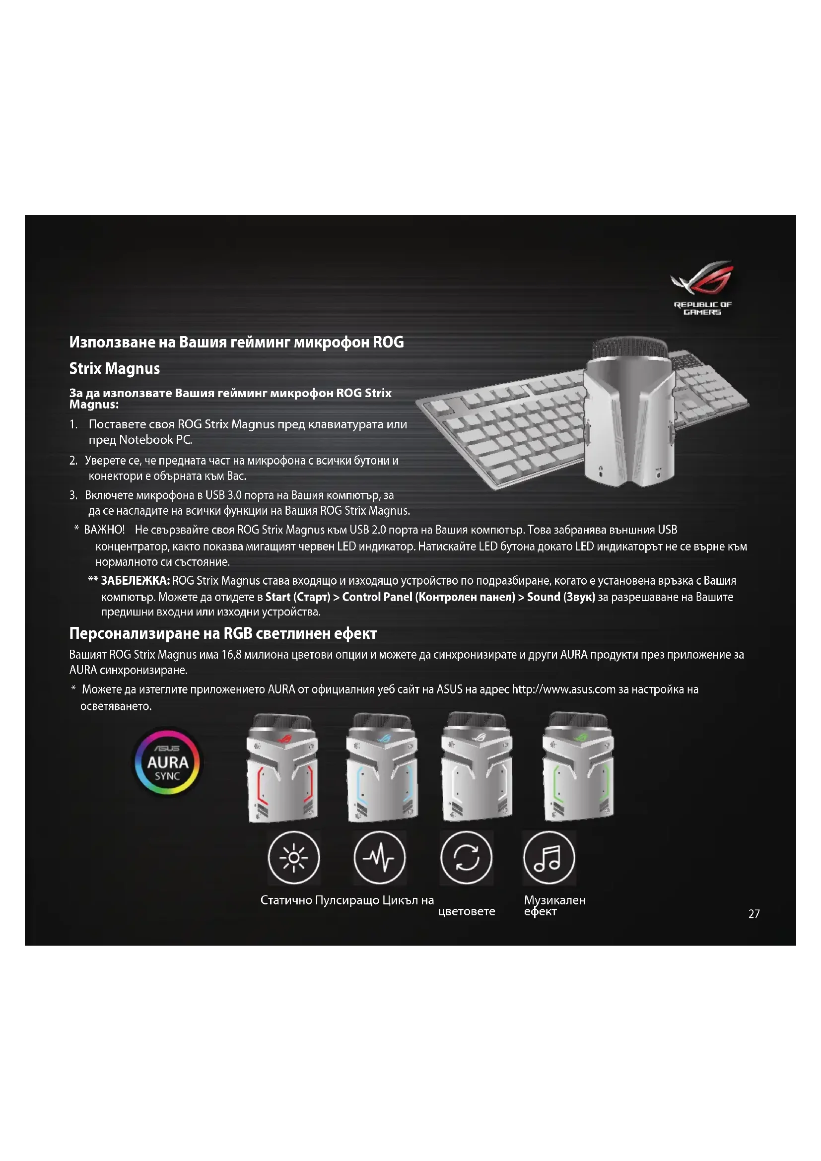 - ВАЖНО! Не свързвайте своя ROG Strix Magnus към USB 2.0 порта на Вашия компютър. Това забранява външния USB концентратор, както показва мигащият червен LED индикатор. Натискайте LED бутона докато LED индикаторът не се върне към нормалното си състояние. ** ЗАБЕЛЕЖКА: ROG Strix Magnus става входящо и изходящо устройство по подразбиране, когато е установена връзка с Вашия компютър. Можете да отидете в Start (Старт) > Control Panel (Контролен панел) > Sound (Звук) за разрешаване на Вашите предишни входни или изходни устройства. Персонализиране на RGB светлинен ефект Вашият ROG Strix Magnus има 16,8 милиона цветови опции и можете да синхронизирате и други AURA продукти през приложение за AURA синхронизиране.
