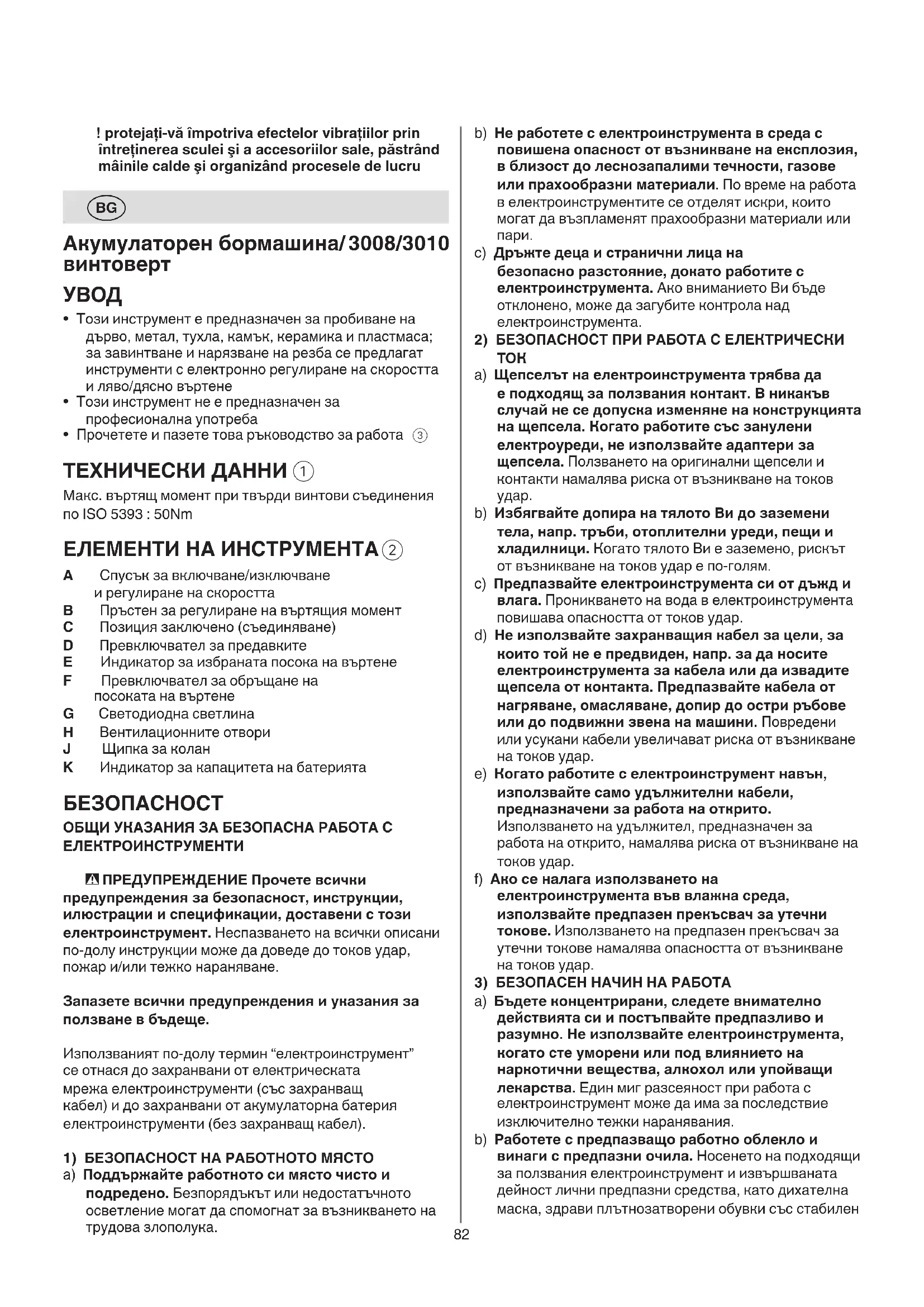 A Спусък за включване/изключване и pегулиpане на скоpостта B Пръстен за регулиране на въртящия момент C Позиция заключено (съединяване) D Превключвател за предавките E Индикатор за избраната посока на въртене F Пpевключвател за обpъщане на посоката на въpтене G Светодиодна светлина H Вентилационните отвоpи J Щипка за колан K Индикатор за капацитета на батерията БЕЗОПАСНОСТ ОБЩИ УКАЗАНИЯ ЗА БЕЗОПАСНА РАБОТА С ЕЛЕКТРОИНСТРУМЕНТИ - ПРЕДУПРЕЖДЕНИЕ Прочете всички предупреждения за безопасност, инструкции, илюстрации и спецификации, доставени с този електроинструмент. Неспазването на всички описани по-долу инструкции може да доведе до токов удар, пожар и/или тежко нараняване. Запазете всички предупреждения и указания за ползване в бъдеще. Използваният по-долу термин “електроинструмент” се отнася до захранвани от електрическата мрежа електроинструменти (със захранващ кабел) и до захранвани от акумулаторна батерия електроинструменти (без захранващ кабел).