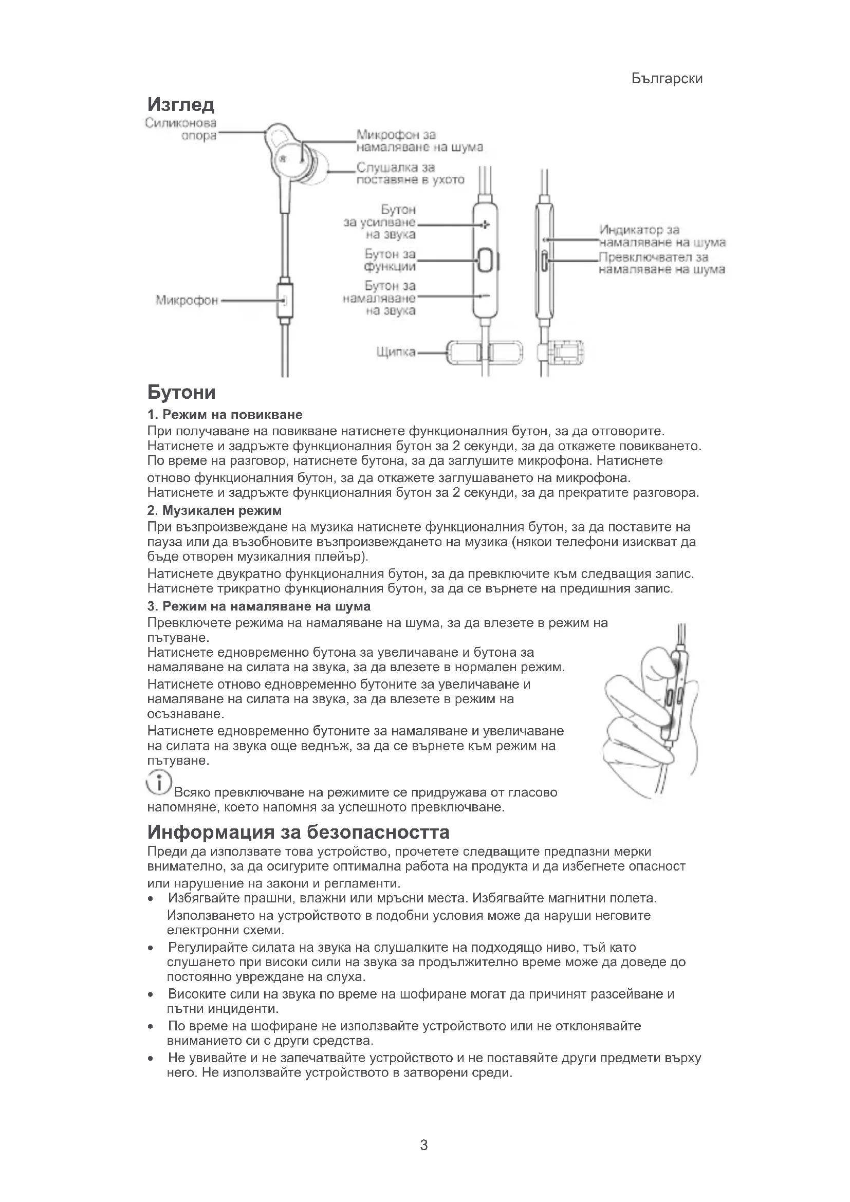 Всяко превключване на режимите се придружава от гласово напомняне, което напомня за успешното превключване. Информация за безопасността Преди да използвате това устройство, прочетете следващите предпазни мерки внимателно, за да осигурите оптимална работа на продукта и да избегнете опасност или нарушение на закони и регламенти.