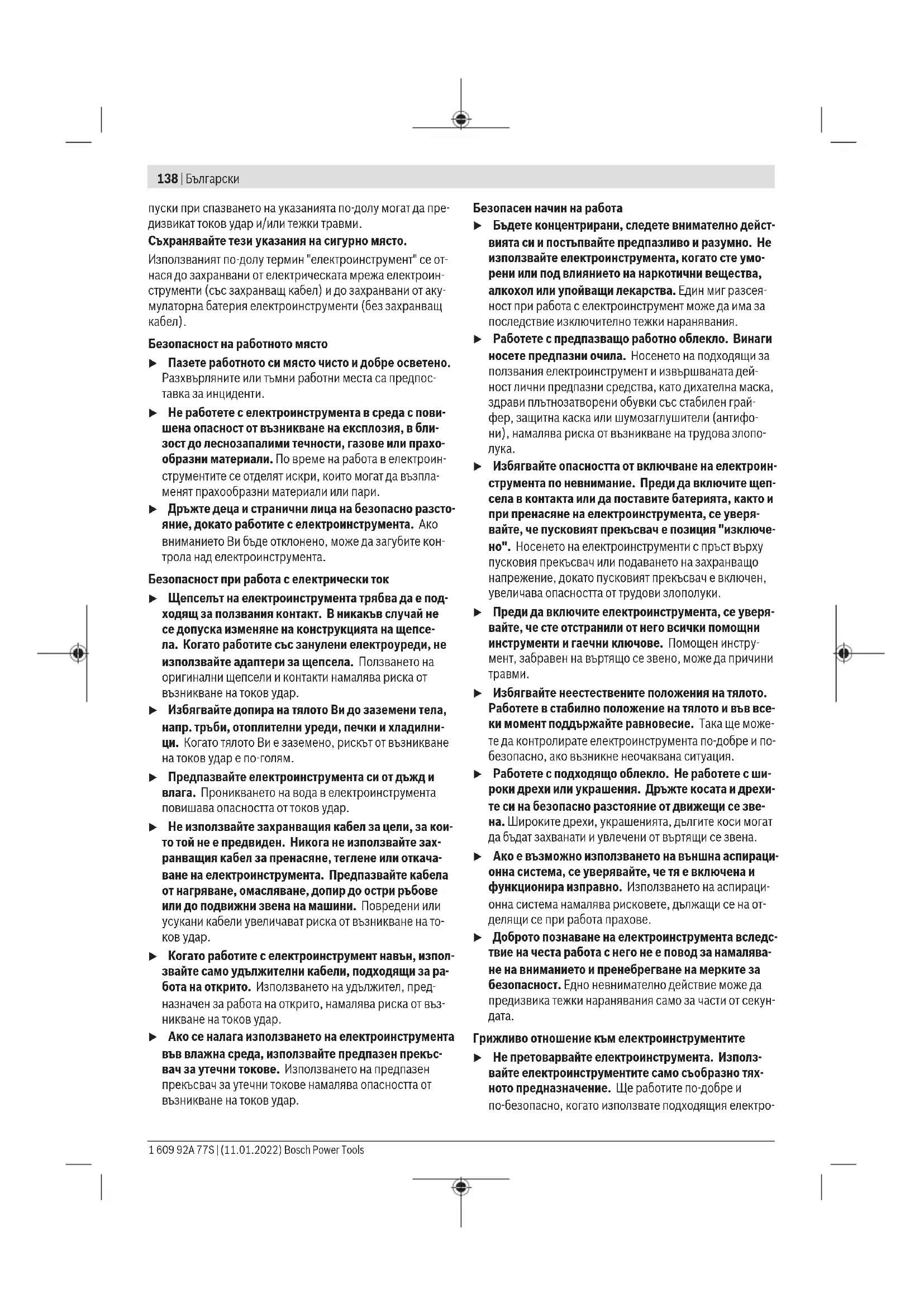 Прочетете всички предупрежде- ния, указания, запознайте се с фигурите и техническите харак- теристики, приложени към електроинструмента. Про- Bosch Power Tools 1 609 92A 77S | (11.01.2022)138 | Български пуски при спазването на указанията по-долу могат да пре- дизвикат токов удар и/или тежки травми. Съхранявайте тези указания на сигурно място. Използваният по-долу термин "електроинструмент" се от- нася до захранвани от електрическата мрежа електроин- струменти (със захранващ кабел) и до захранвани от аку- мулаторна батерия електроинструменти (беззахранващ