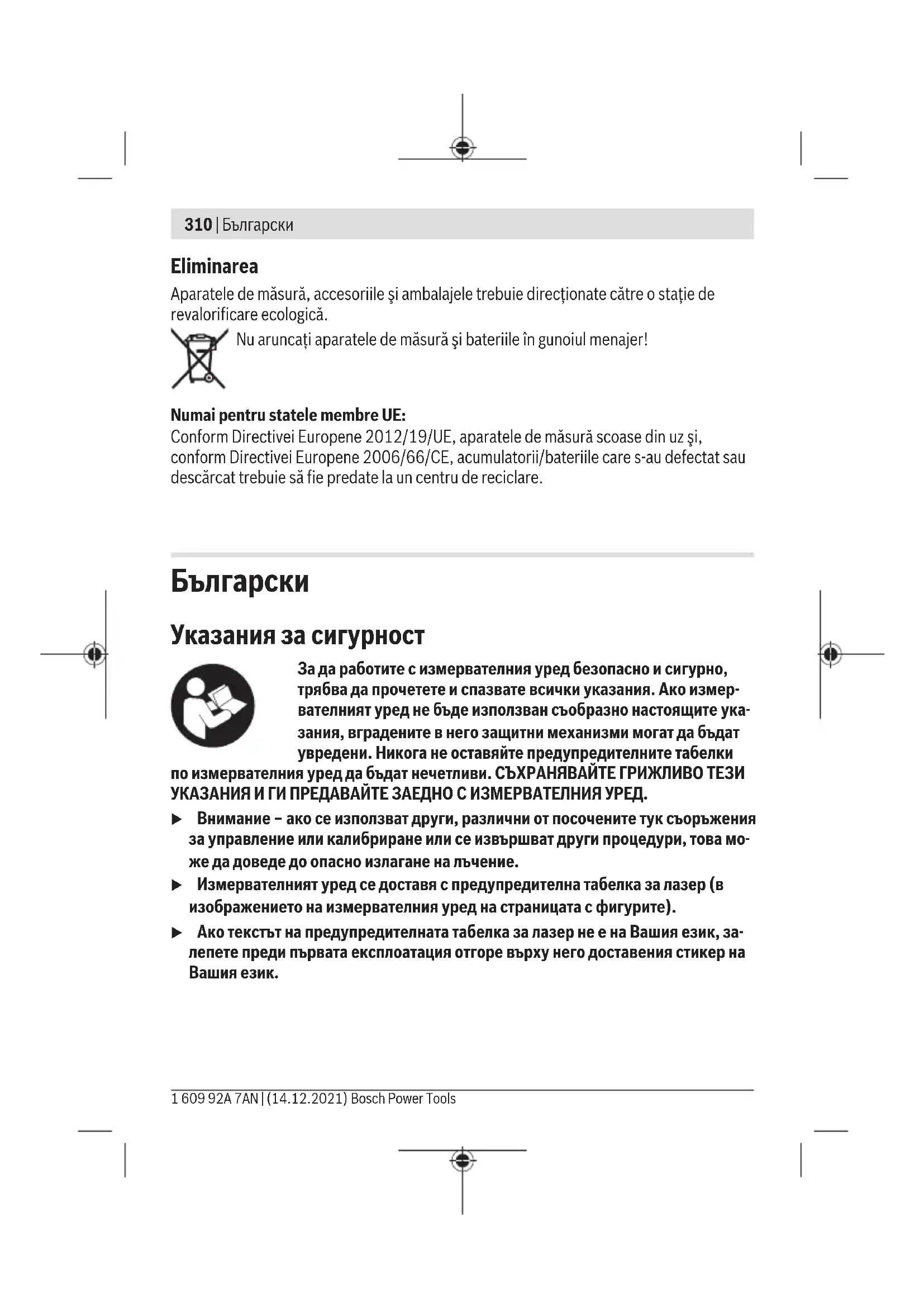 Очила за наблюдаване на лазерния лъч (принадлежност) Очилата за наблюдаване на лазерния лъч филтрират околната светлина. Така лазер- ният лъч става по-лесно различим. u Не използвайте лазерните очила (принадлежност) като защитни очила. Ла- зерните очила служат за по-добро разпознаване на лазерния лъч; те не предпаз- ват от лазерно лъчение. u Не използвайте лазерните очила (принадлежност) като слънчеви очила или при шофиране. Лазерните очила не предлагат пълна UV защита и намаляват въз- приемането на цветовете. Работн ипримери (вижте фиг. F–H) Примери за приложението на измервателния уред можете да видите на страницата с фигурите. 1 609 92A 7AN | (14.12.2021) Bosch Power ToolsБългарски | 323 Поддържане и сервиз Поддържане и почистване Поддържайте измервателния уред винаги чист. Не потопявайте измервателния уред във вода или други течности. Избърсвайте замърсяванията с мека, леко навлажнена кърпа. Не използвайте по- чистващи препарати или разтворители. Почиствайте редовно специално повърхностите на изхода на лазерния лъч и внима- вайте да не остават власинки. Съхранявайте и пренасяйте измервателния уред само във включената в окомплек- товката предпазна чанта (21). При необходимост от ремонт предоставяйте измервателния уред в чантата (21). Клиентска служба и консултация относно употребата Сервизът ще отговори на въпросите Ви относно ремонти и поддръжка на закупения от Вас продукт, както и относно резервни части. Покомпонентни чертежи и инфор- мация за резервните части ще откриете и на: www.bosch-pt.com Екипът по консултация относно употребата на Bosch ще Ви помогне с удоволствие при въпроси за нашите продукти и техните аксесоари. Моля, при въпроси и при поръчване на резервни части винаги посочвайте 10-циф- рения каталожен номер, изписан на табелката на уреда.