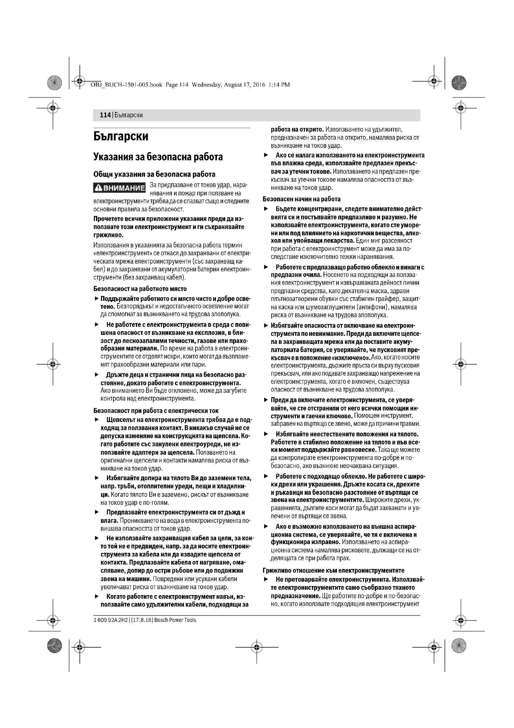 Преди да включите електроинструмента, се уверя- вайте, че сте отстранили от него всички помощни ин- струменти и гаечни ключове. Помощен инструмент, забравен на въртящо се звено, може да причини травми. Избягвайте неестествените положения на тялото. Работете в стабилно положение на тялото и във все- ки момент поддържайте равновесие. Така ще можете да контролирате електроинструмента по-добре и по- безопасно, ако възникне неочаквана ситуация. Работете с подходящо облекло. Не работете с широ- ки дрехи или украшения. Дръжте косата си, дрехите и ръкавици на безопасно разстояние от въртящи се звена на електроинструментите. Широките дрехи, ук- рашенията, дългите коси могат да бъдат захванати и ув- лечени от въртящи се звена. Ако е възможно използването на външна аспира- ционна система, се уверявайте, че тя е включена и функционира изправно. Използването на аспира- ционна система намалява рисковете, дължащи се на от- делящата се при работа прах. Грижливо отношение към електроинструментите Не претоварвайте електроинструмента. Използвай- те електроинструментите само съобразно тяхното предназначение. Ще работите по-добре и по-безопас- но, когато използвате подходящия електроинструмент OBJ_BUCH-1501-005.book Page 114 Wednesday, August 17, 2016 1:14 PMБългарски | 115 Bosch Power Tools 1 609 92A 2H2 | (17.8.16) в зададения от производителя диапазон на натоварва-
