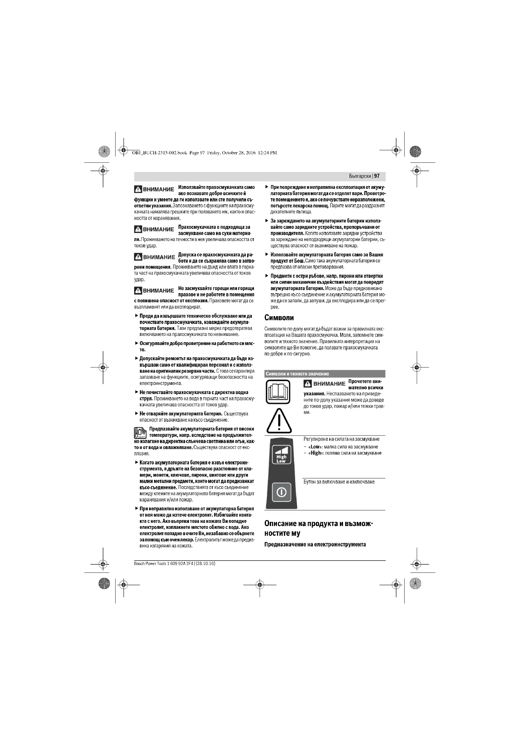 рантирате, че деца няма да играят с прахосмукачката. Не засмуквайте опасни за здравето вещества, напр. прах от бук или дъб, каменна прах, асбест. Те се считат за канцерогенни. Информирайте се за валидните нормативни докумен- ти/закони относно работа с опасни за здравето прахове във Вашата страна. OBJ_BUCH-2315-002.book Page 96 Friday, October 28, 2016 12:24 PMБългарски | 97 Bosch Power Tools 1 609 92A 2F4 | (28.10.16) Използвайте прахосмукачката само ако познавате добре всичките й функции и умеете да ги използвате или сте получили съ- ответни указания. Запознаването с функциите на прахосму- качката намалява грешките при ползването им, както и опас- ността от наранявания. Прахосмукачката е подходяща за засмукване само на сухи материа-