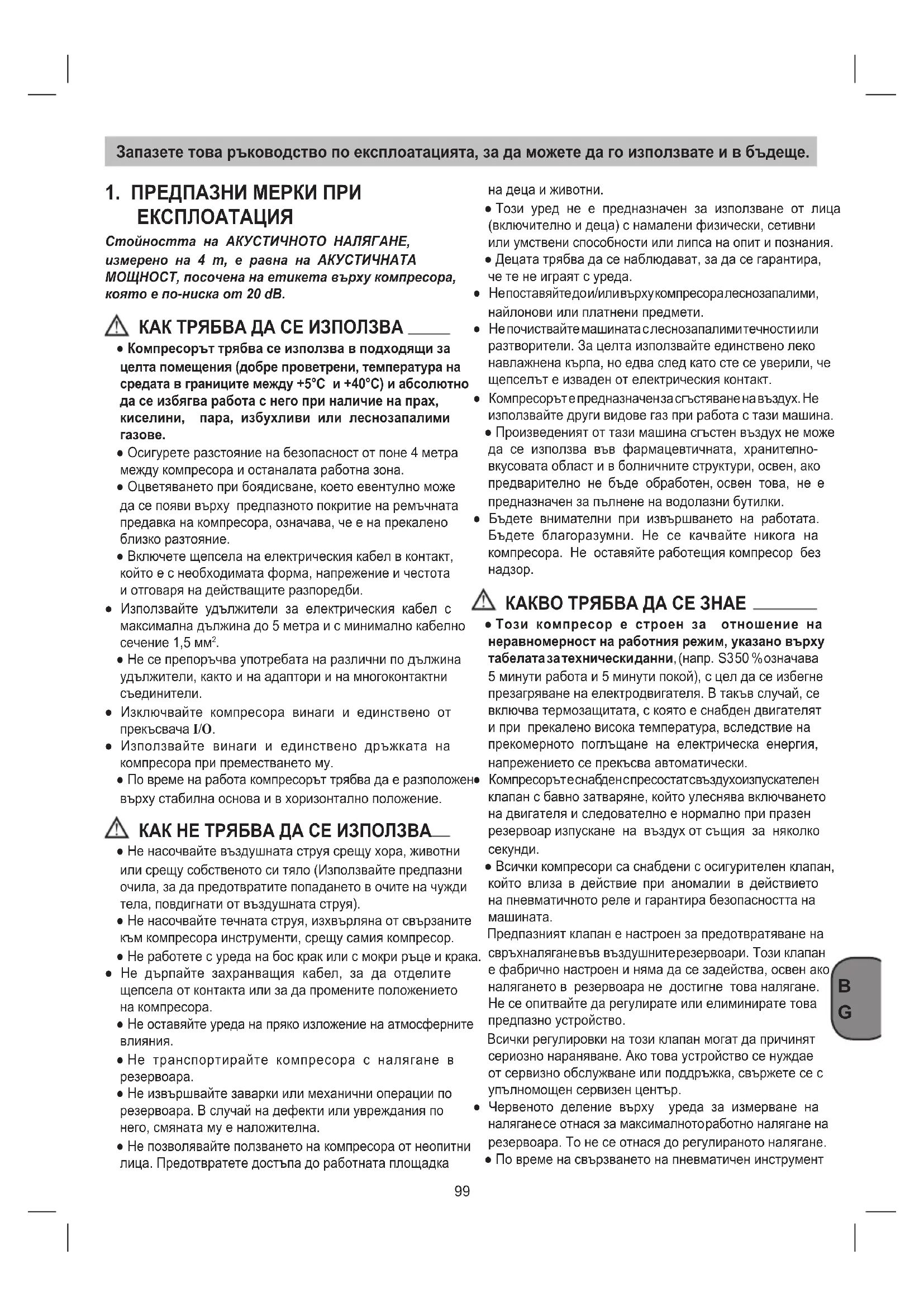 ● Не се препоръчва употребата на различни по дължина удължители, както и на адаптори и на многоконтактни съединители. ● Изключвайте компресора винаги и единствено от прекъсвача I/O. ● Използвайте винаги и единствено дръжката на компресора при преместването му. ● По време на работа компресорът трябва да е разположен върху стабилна основа и в хоризонтално положение. КАК НЕ ТРЯБВА ДА СЕ ИЗПОЛЗВА ● Не насочвайте въздушната струя срещу хора, животни или срещу собственото си тяло (Използвайте предпазни очила, за да предотвратите попадането в очите на чужди тела, повдигнати от въздушната струя). ● Не насочвайте течната струя, изхвърляна от свързаните към компресора инструменти, срещу самия компресор. ● Не работете с уреда на бос крак или с мокри ръце и крака. ● Не дърпайте захранващия кабел, за да отделите щепсела от контакта или за да промените положението на компресора. ● Не оставяйте уреда на пряко изложение на атмосферните влияния. ● Не транспортирайте компресора с налягане в резервоара. ● Не извършвайте заварки или механични операции по резервоара. В случай на дефекти или увреждания по него, смяната му е наложителна. ● Не позволявайте ползването на компресора от неопитни лица. Предотвратете достъпа до работната площадка на деца и животни. ● Този уред не е предназначен за използване от лица (включително и деца) с намалени физически, сетивни или умствени способности или липса на опит и познания. ● Децата трябва да се наблюдават, за да се гарантира, че те не играят с уреда. ● Не поставяйте до и/или върху компресора леснозапалими, найлонови или платнени предмети. ● Не почиствайте машината с леснозапалими течности или разтворители. За целта използвайте единствено леко навлажнена кърпа, но едва след като сте се уверили, че щепселът е изваден от електрическия контакт. ● Компресорът е предназначен за сгъстяване на въздух. Не използвайте други видове газ при работа с тази машина. ● Произведеният от тази машина сгъстен въздух не може да се използва във фармацевтичната, хранително- вкусовата област и в болничните структури, освен, ако предварително не бъде обработен, освен това, не е предназначен за пълнене на водолазни бутилки. ● Бъдете внимателни при извършването на работата. Бъдете благоразумни. Не се качвайте никога на компресора. Не оставяйте работещия компресор без надзор. КАКВО ТРЯБВА ДА СЕ ЗНАЕ ● Този компресор е строен за отношение на неравномерност на работния режим, указано върху табелата за технически данни, (напр. S3 50 % означава 5 минути работа и 5 минути покой), с цел да се избегне презагряване на електродвигателя. В такъв случай, се включва термозащитата, с която е снабден двигателят и при прекалено висока температура, вследствие на прекомерното поглъщане на електрическа енергия, напрежението се прекъсва автоматически. ● Компресорът е снабден с пресостат с въздухоизпускателен клапан с бавно затваряне, който улеснява включването на двигателя и следователно е нормално при празен резервоар изпускане на въздух от същия за няколко секунди. ● Всички компресори са снабдени с осигурителен клапан, който влиза в действие при аномалии в действието на пневматичното реле и гарантира безопасността на машината. Предпазният клапан е настроен за предотвратяване на свръхналягане във въздушните резервоари. Този клапан е фабрично н