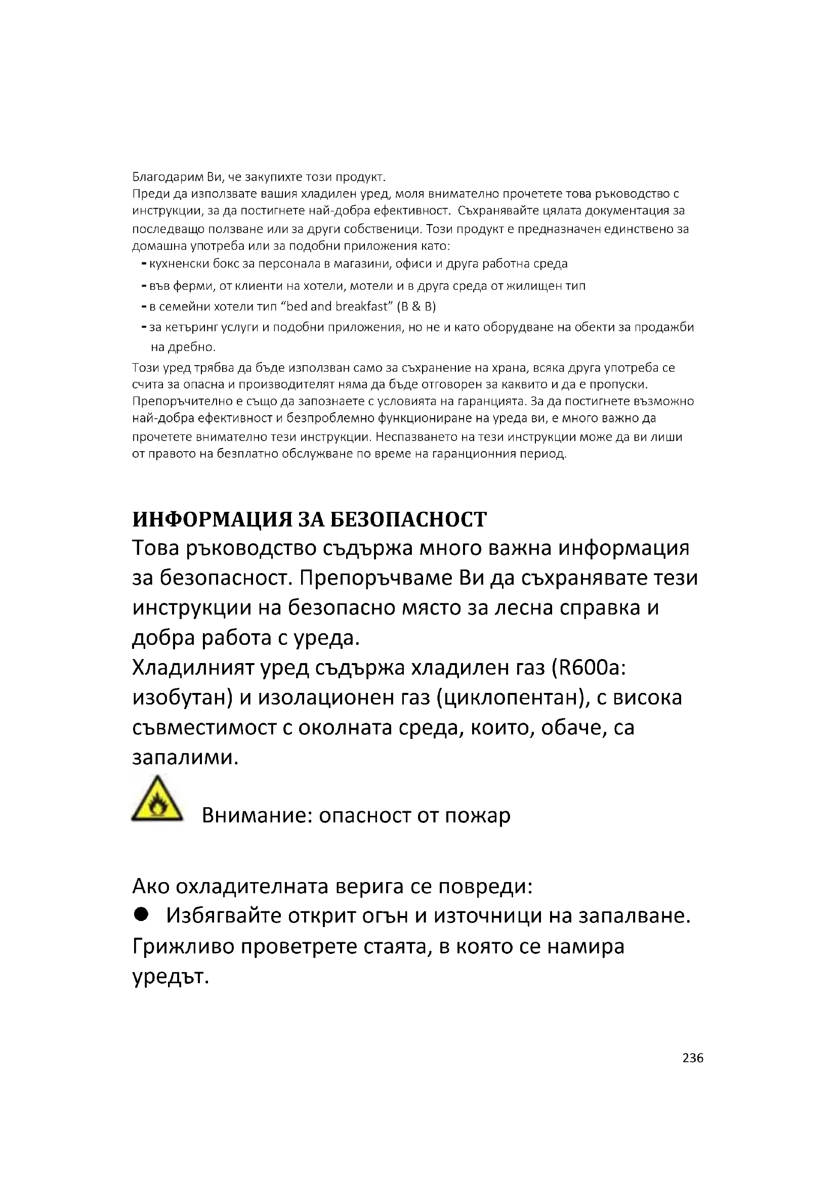 Този уред трябва да бъде използван само за съхранение на храна, всяка друга употреба се счита за опасна и производителят няма да бъде отговорен за каквито и да е пропуски. Препоръчително е също да запознаете с условията на гаранцията. За да постигнете възможно най-добра ефективност и безпроблемно функциониране на уреда ви, е много важно да прочетете внимателно тези инструкции. Неспазването на тези инструкции може да ви лиши от правото на безплатно обслужване по време на гаранционния период. ИНФОРМАЦИЯ ЗА БЕЗОПАСНОСТ Това ръководство съдържа много важна информация за безопасност. Препоръчваме Ви да съхранявате тези инструкции на безопасно място за лесна справка и добра работа с уреда. Хладилният уред съдържа хладилен газ (R600a: изобутан) и изолационен газ (циклопентан), с висока съвместимост с околната среда, които, обаче, са