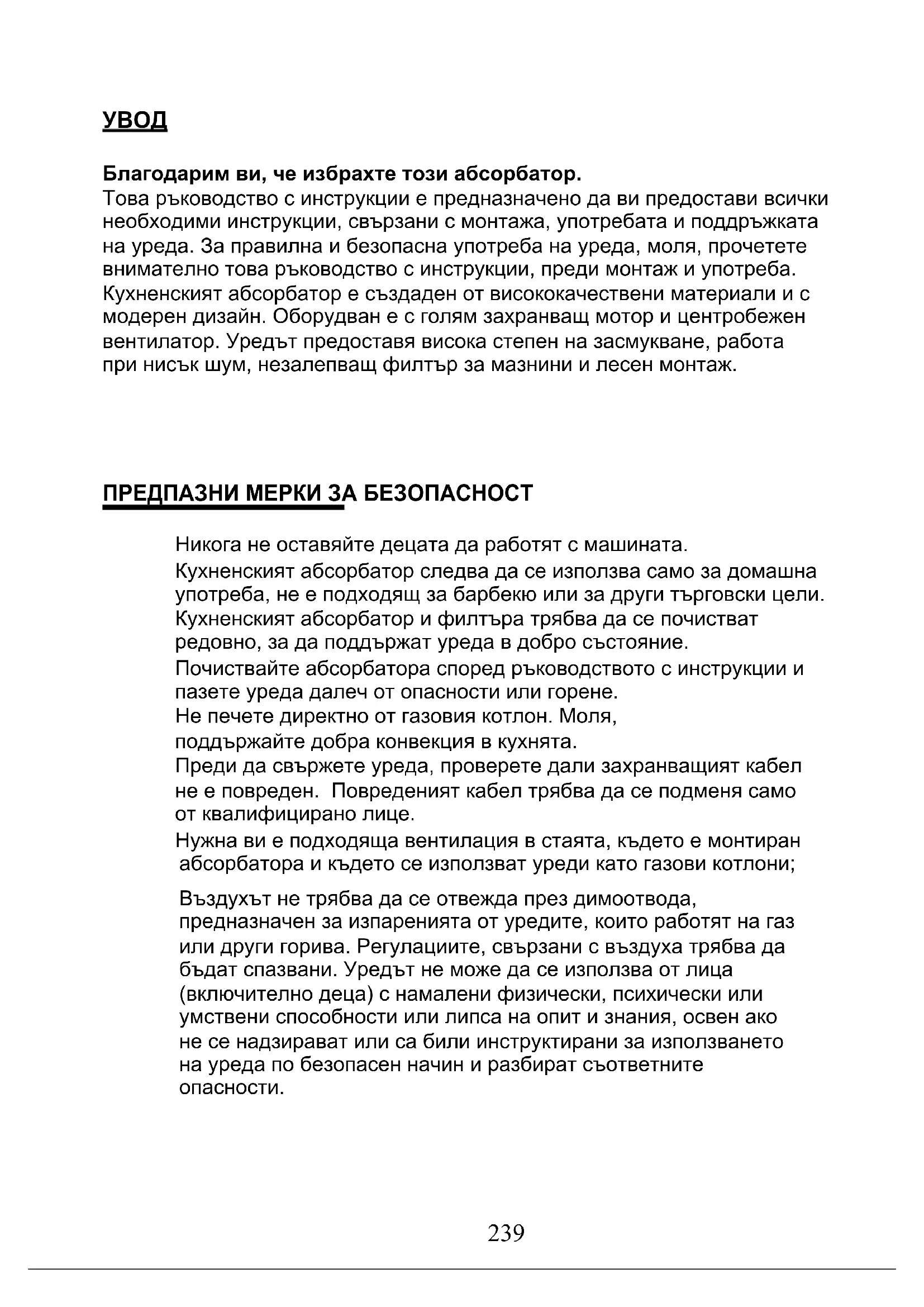Благодарим ви, че избрахте този абсорбатор. Това ръководство с инструкции е предназначено да ви предостави всички необходими инструкции, свързани с монтажа, употребата и поддръжката на уреда. За правилна и безопасна употреба на уреда, моля, прочетете внимателно това ръководство с инструкции, преди монтаж и употреба. Кухненският абсорбатор е създаден от висококачествени материали и с модерен дизайн. Оборудван е с голям захранващ мотор и центробежен вентилатор. Уредът предоставя висока степен на засмукване, работа при нисък шум, незалепващ филтър за мазнини и лесен монтаж. ПРЕДПАЗНИ МЕРКИ ЗА БЕЗОПАСНОСТ Никога не оставяйте децата да работят с машината. Кухненският абсорбатор следва да се използва само за домашна употреба, не е подходящ за барбекю или за други търговски цели. Кухненският абсорбатор и филтъра трябва да се почистват редовно, за да поддържат уреда в добро състояние. Почиствайте абсорбатора според ръководството с инструкции и пазете уреда далеч от опасности или горене. Не печете директно от газовия котлон. Моля, поддържайте добра конвекция в кухнята. Преди да свържете уреда, проверете дали захранващият кабел не е повреден. Повреденият кабел трябва да се подменя само от квалифицирано лице. Нужна ви е подходяща вентилация в стаята, където е монтиран абсорбатора и където се използват уреди като газови котлони; Въздухът не трябва да се отвежда през димоотвода, предназначен за изпаренията от уредите, които работят на газ или други горива. Регулациите, свързани с въздуха трябва да бъдат спазвани. Уредът не може да се използва от лица (включително деца) с намалени физически, психически или умствени способности или липса на опит и знания, освен ако не се надзирават или са били инструктирани за използването на уреда по безопасен начин и разбират съответните опасности.240 Децата трябва да бъдат надзиравани, за да се гарантира, че не си играят с уреда. Не фламбирайте под абсорбатора. Абсорбаторът не трябва да се монтира над котлон с повече от четири котлона. Опасност от електрически удар Включвайте уреда само в правилно заземен контакт. Ако се колебаете, свържете се с подходящ квалифициран